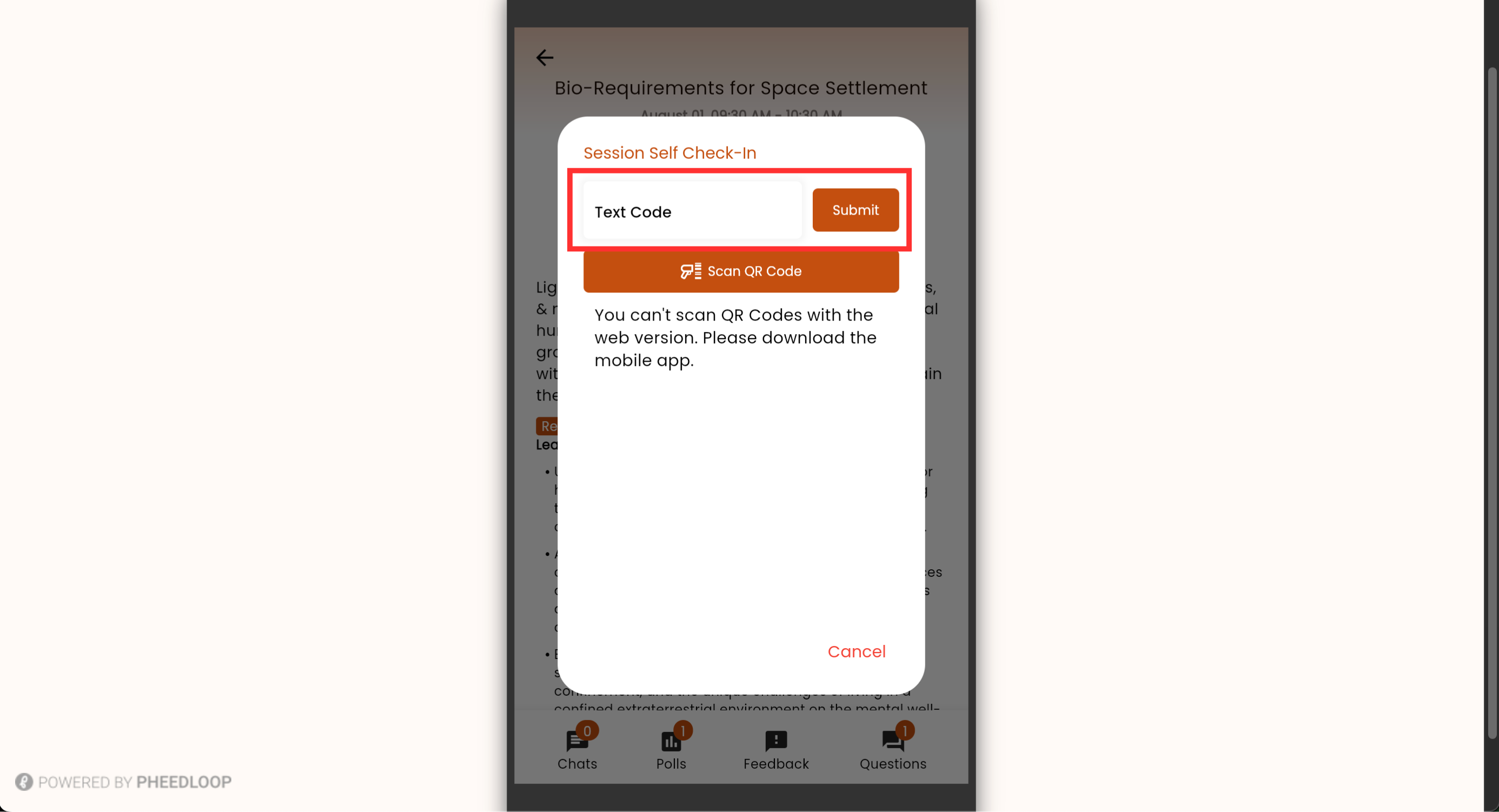 It depends; the option to check yourself into a session is determined by your Event Organizers. If the Event Organizer has allowed self check- ins, all you need to do is open the session page on the Event App and select Check In. You will then have the option to scan the self check-in QR code or enter a case-sensitive text code (if enabled) to check yourself into the session.