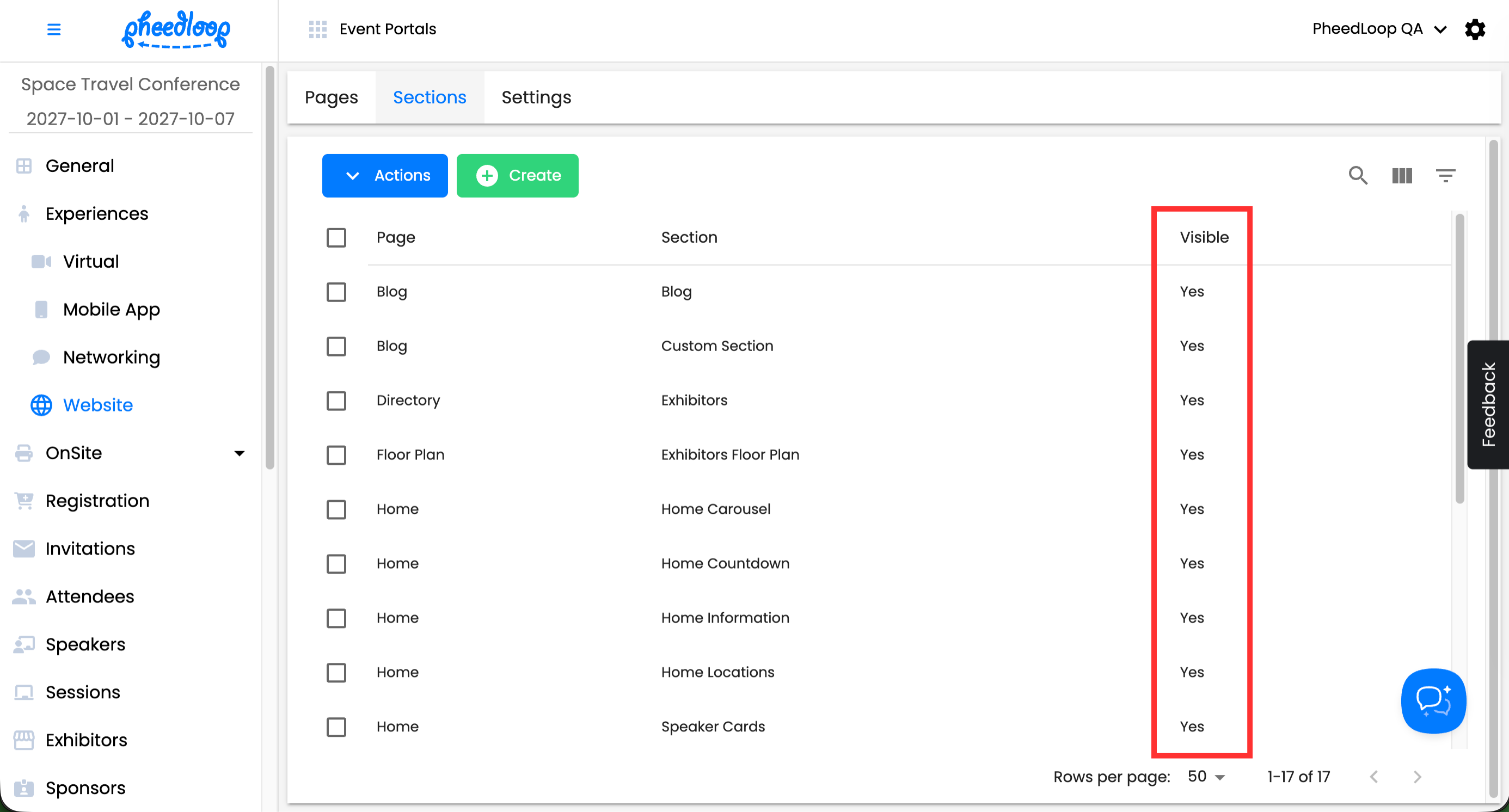 Event Admins can quickly tell what pages and sections are publicly accessible via the Visible column.