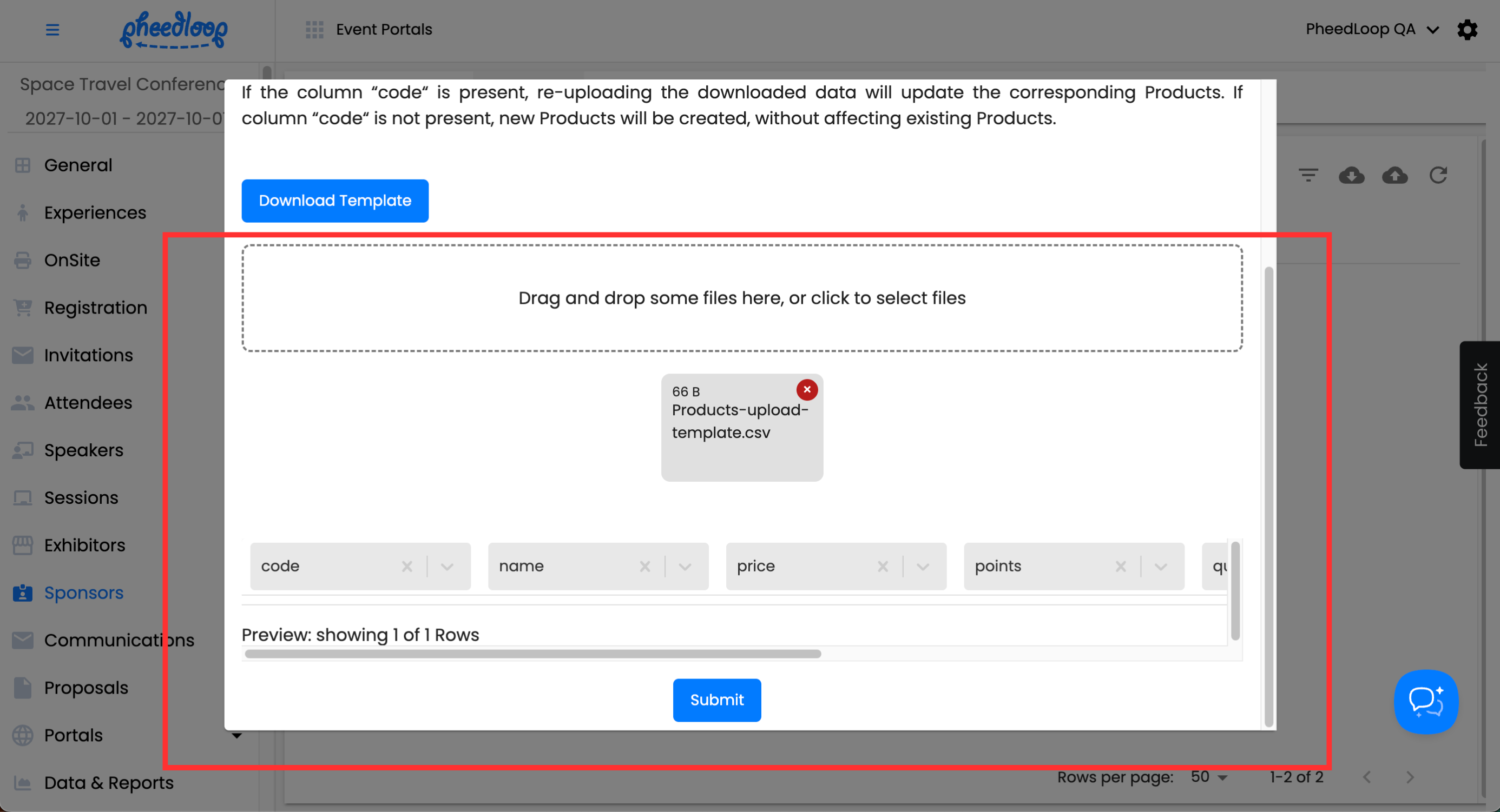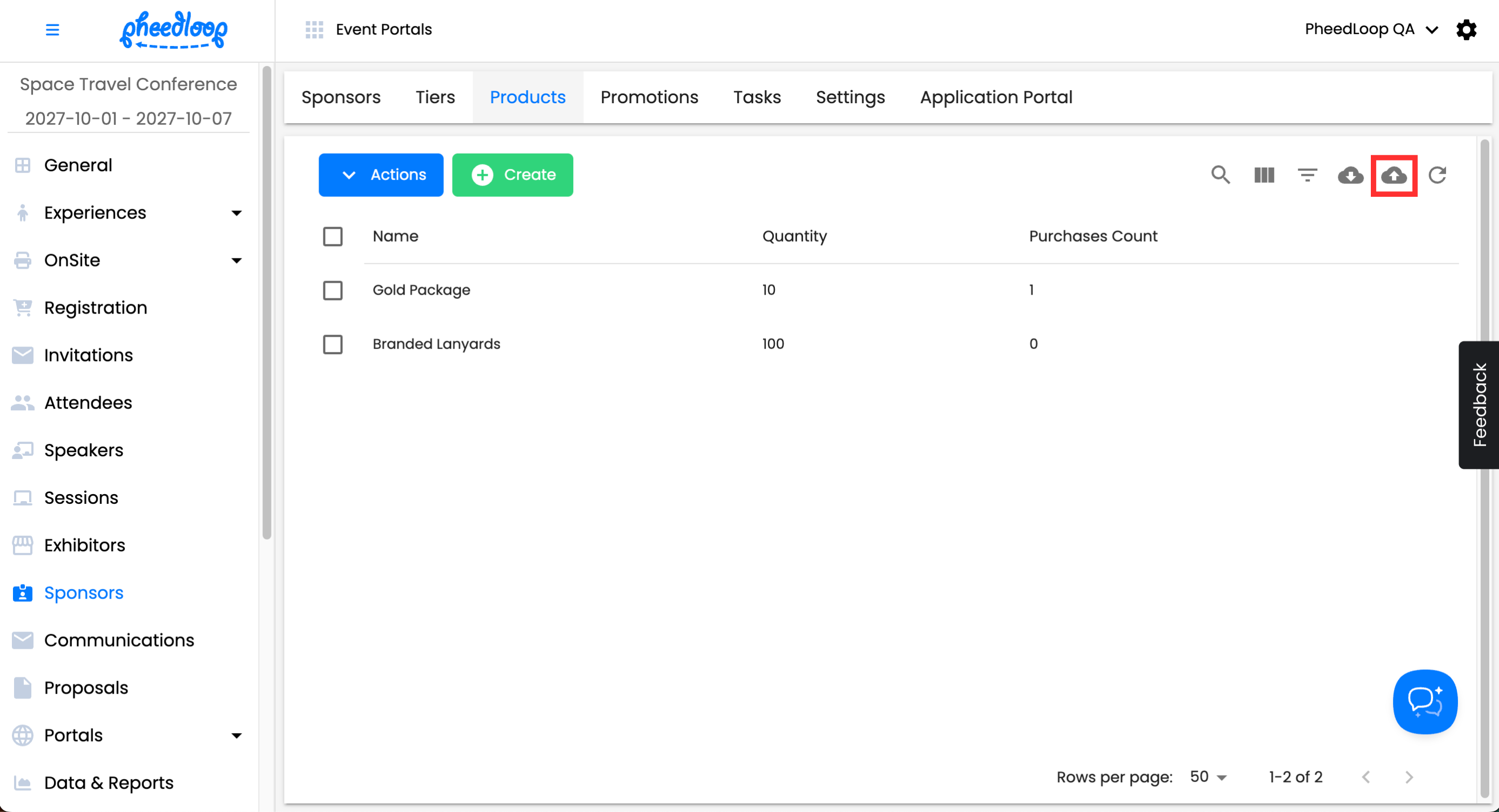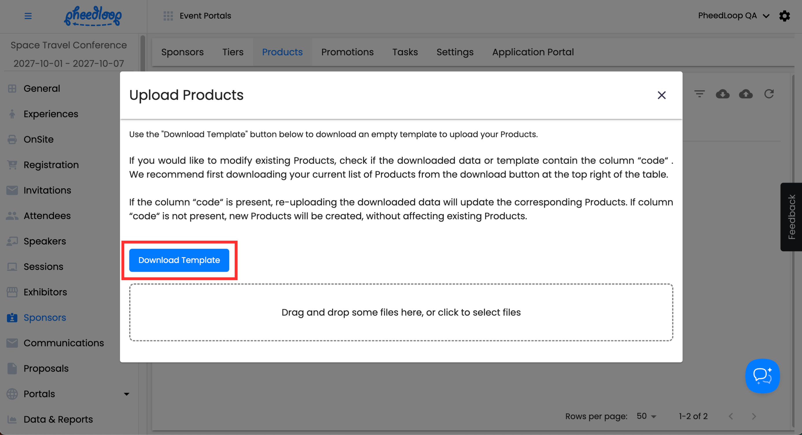 Multiple Products for Sponsors can be uploaded simultaneously into the Event Dashboard.
