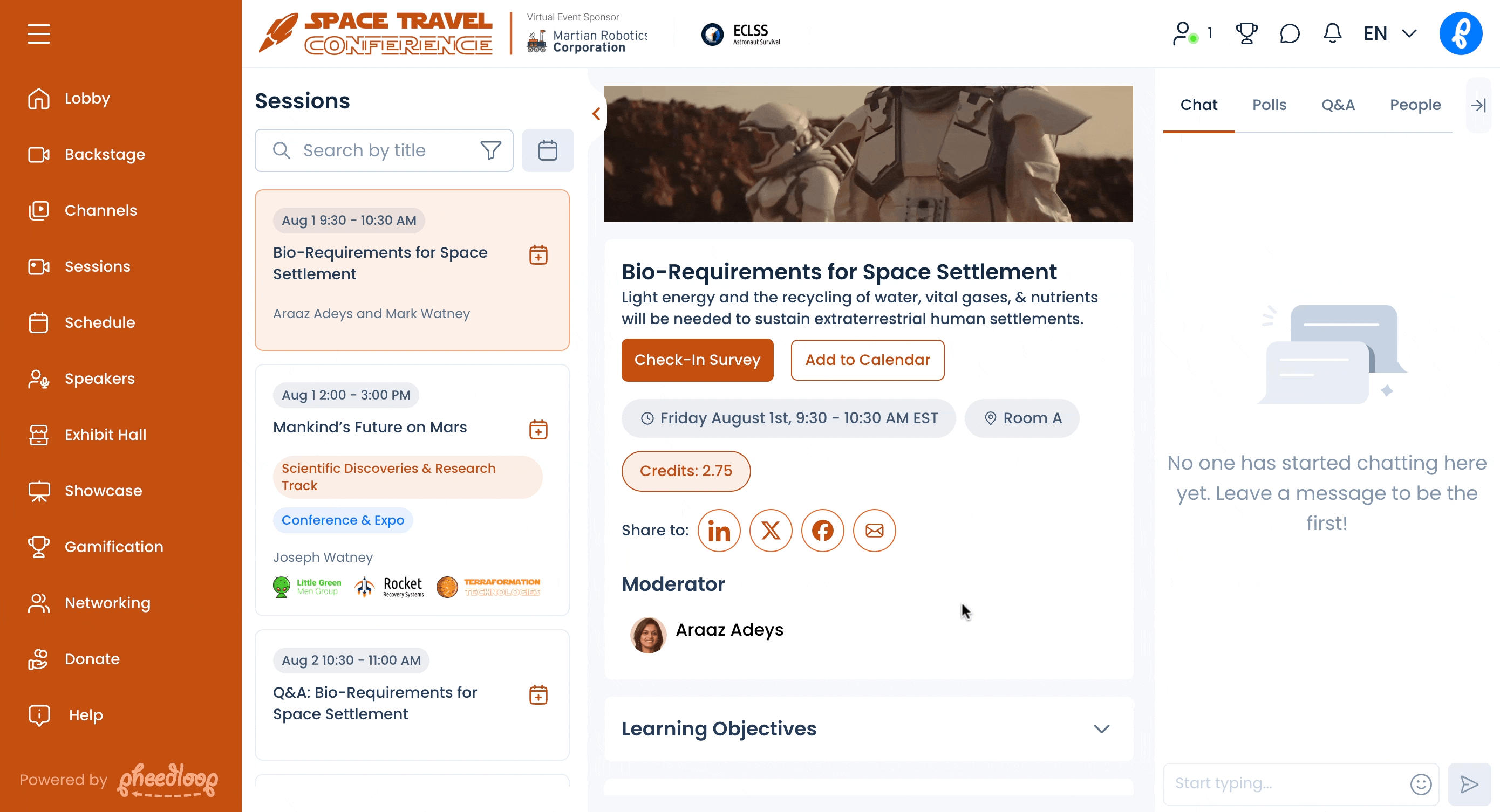 Speakers are visible in the Virtual Portal as long as the Speaker is Visible checkbox is toggled on in the Event Dashboard. All speakers are visible in the Speakers section and their assigned sessions.