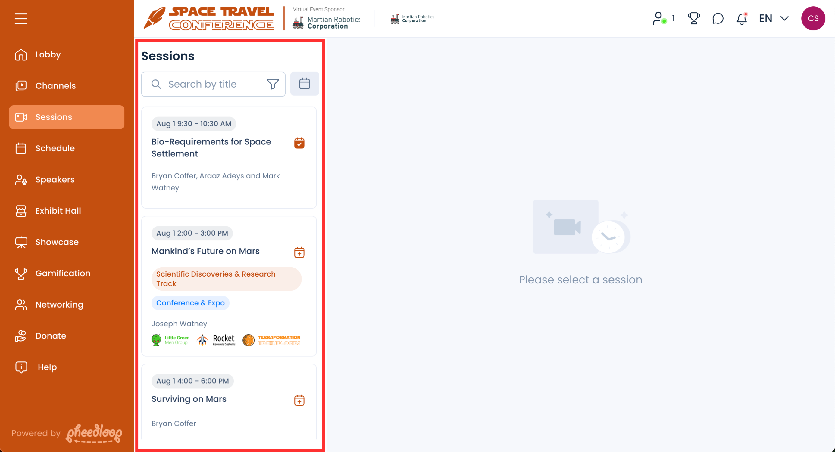 Zoom is a powerful and popular tool used by event planners to host virtual sessions. PheedLoop supports fully functional integration with Zoom which allows you and attendees to view and participate in Zoom meetings and webinars right from the Virtual Event Portal. PheedLoop's integration allows attendees to automatically authenticate and join the Zoom meeting or webinar you are running. The Zoom interface even matches your event's color theme, so everything feels seamless!