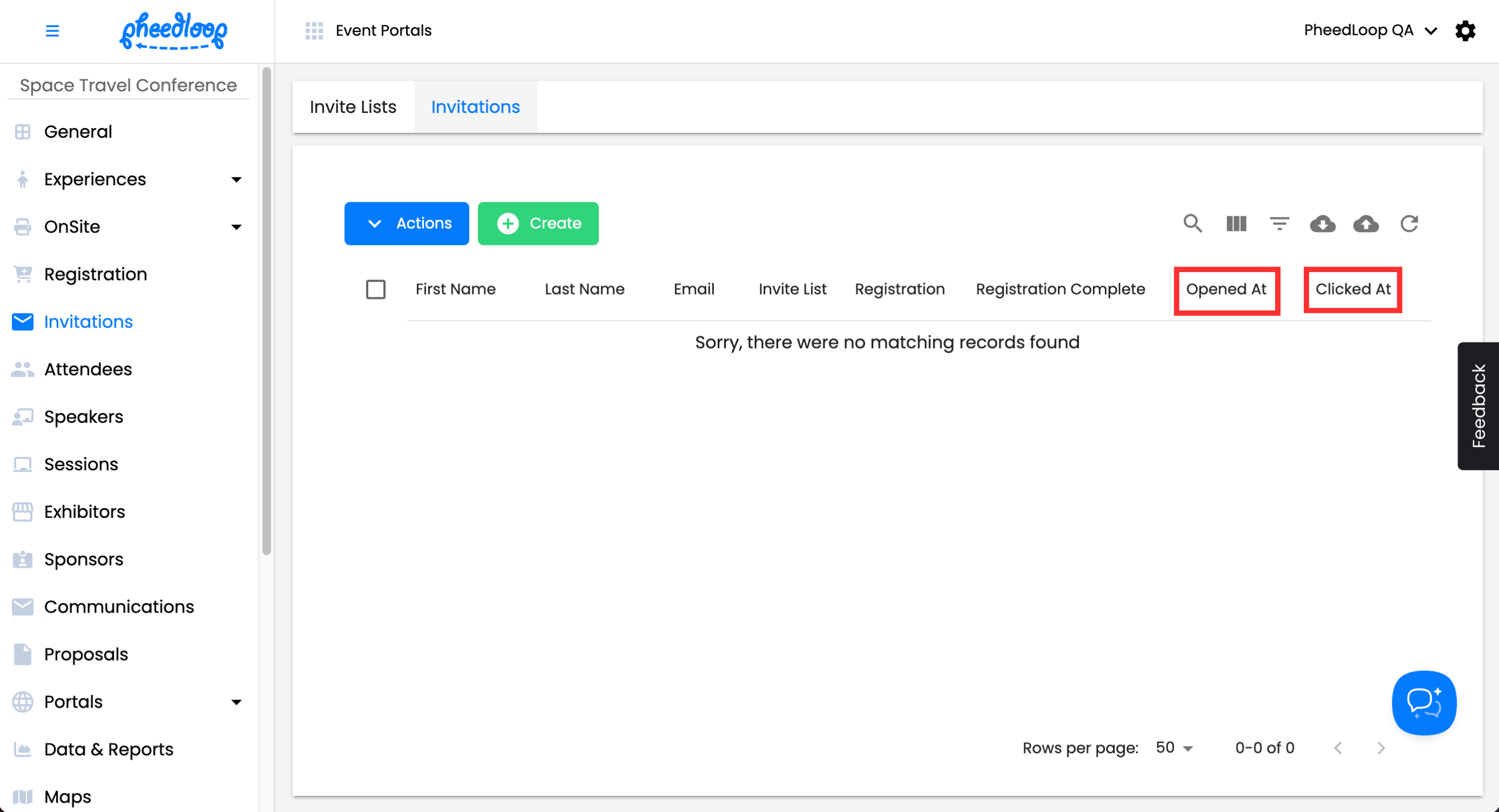 The Invites tab will list all your invitees and indicate whether they have opened the email and clicked on the call-to-action button. This can be found under the Opened At column and Clicked At column, respectively. Please note that an invite list must be assigned to an invitee before they can be added to the Event Dashboard. If an invitee belongs to multiple invite lists, a duplicate entry will be created for each list they are included in.