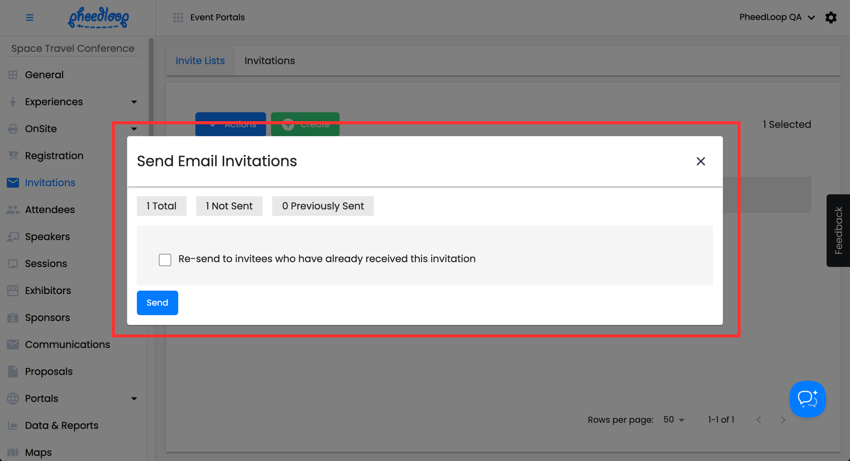 If you would like to send another invitation to an invitee, toggle on the Re-send to invitees who have already received this invitation checkbox.
