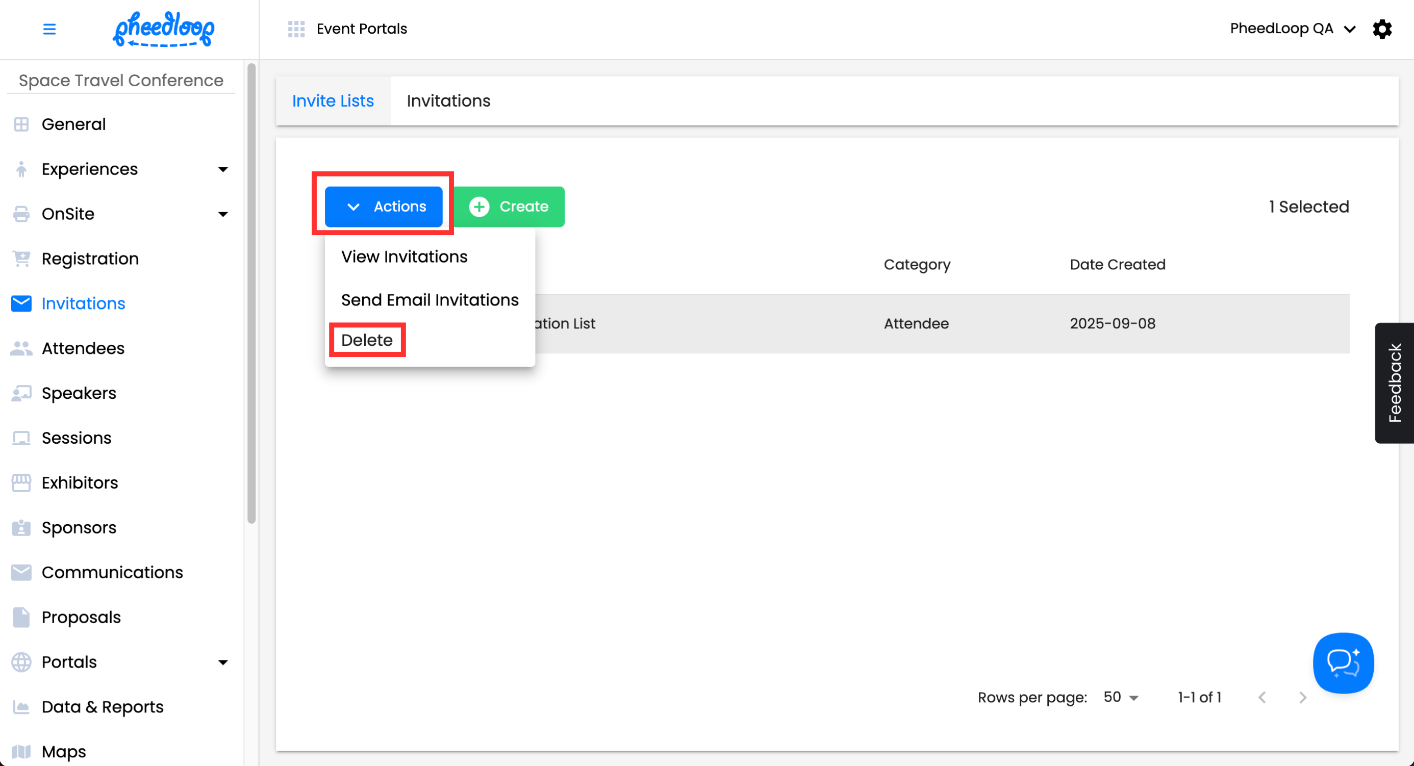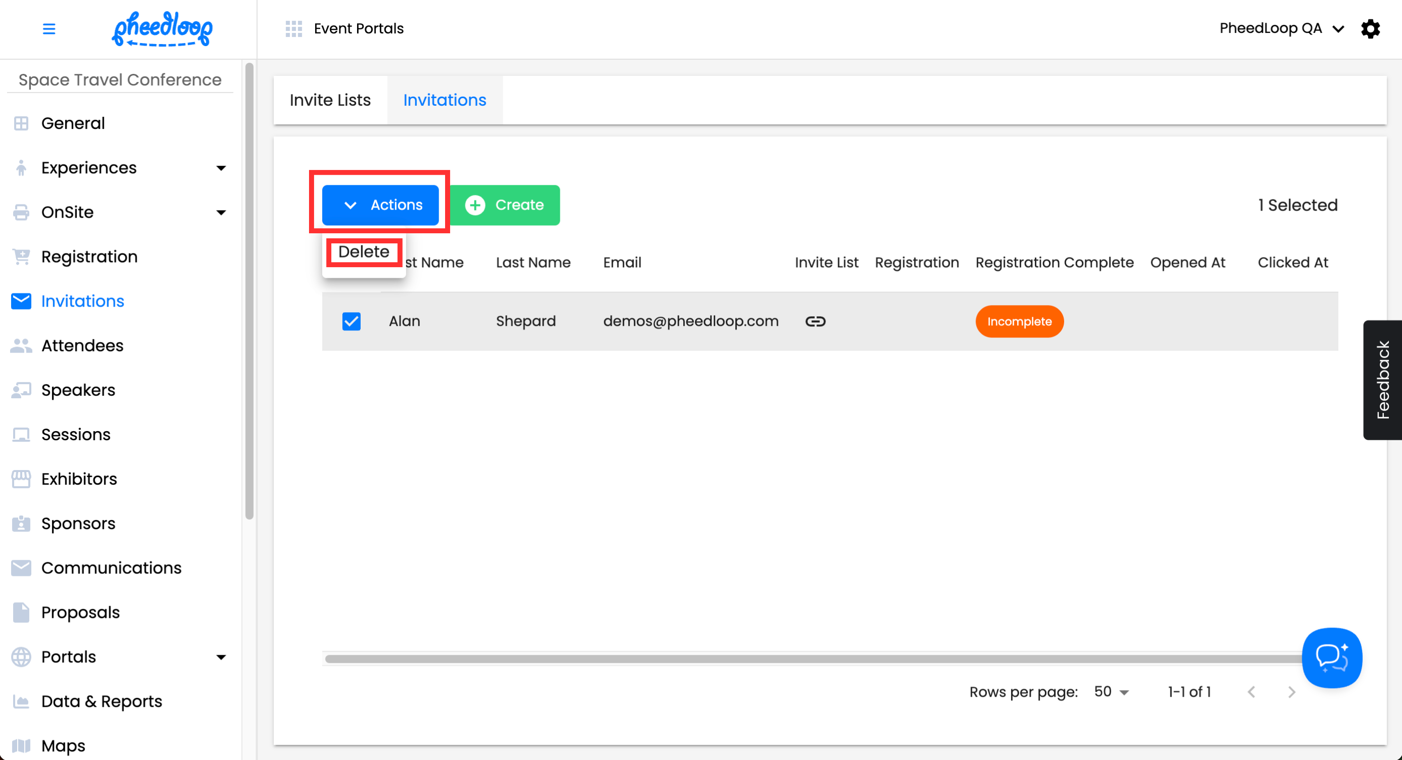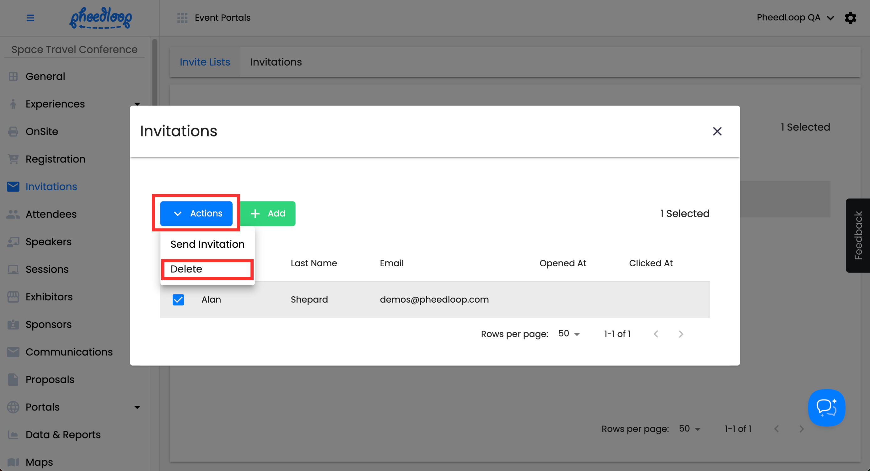 In the new window, select the Invitee you wish to remove from the list and select Actions > Delete