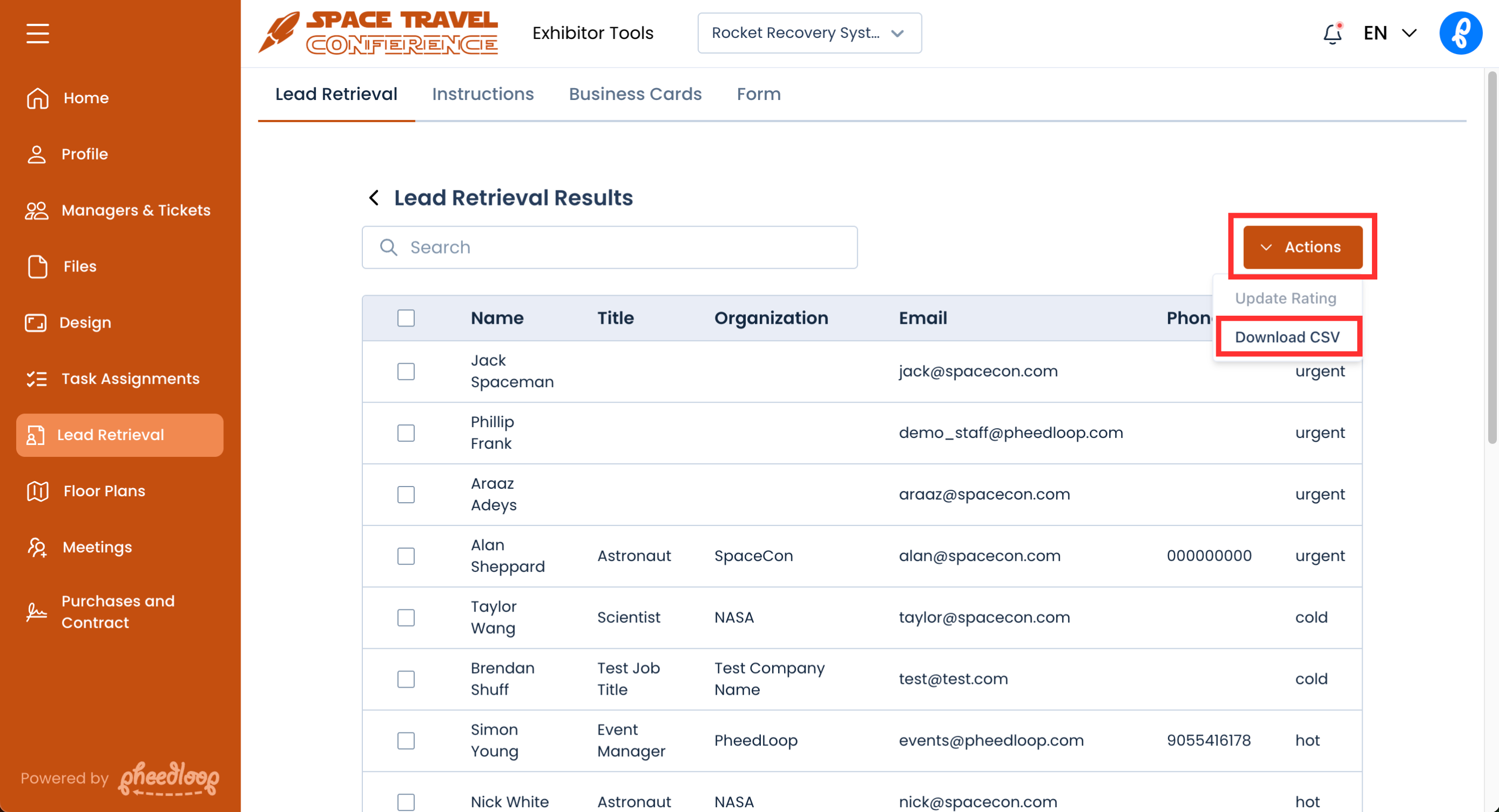 Lead Retrieval provides a structured process for capturing and managing attendee data. Exhibitors and staff can scan QR codes using PheedLoop OnSite or PheedLoop Go! on iOS or Android devices. Captured leads are stored in real time and can be exported via the Exhibitor Portal or as a custom report in the Event Dashboard, allowing for immediate integration with CRM systems or post-event analytics. This ensures accurate tracking of booth interactions and simplifies follow-up workflows.