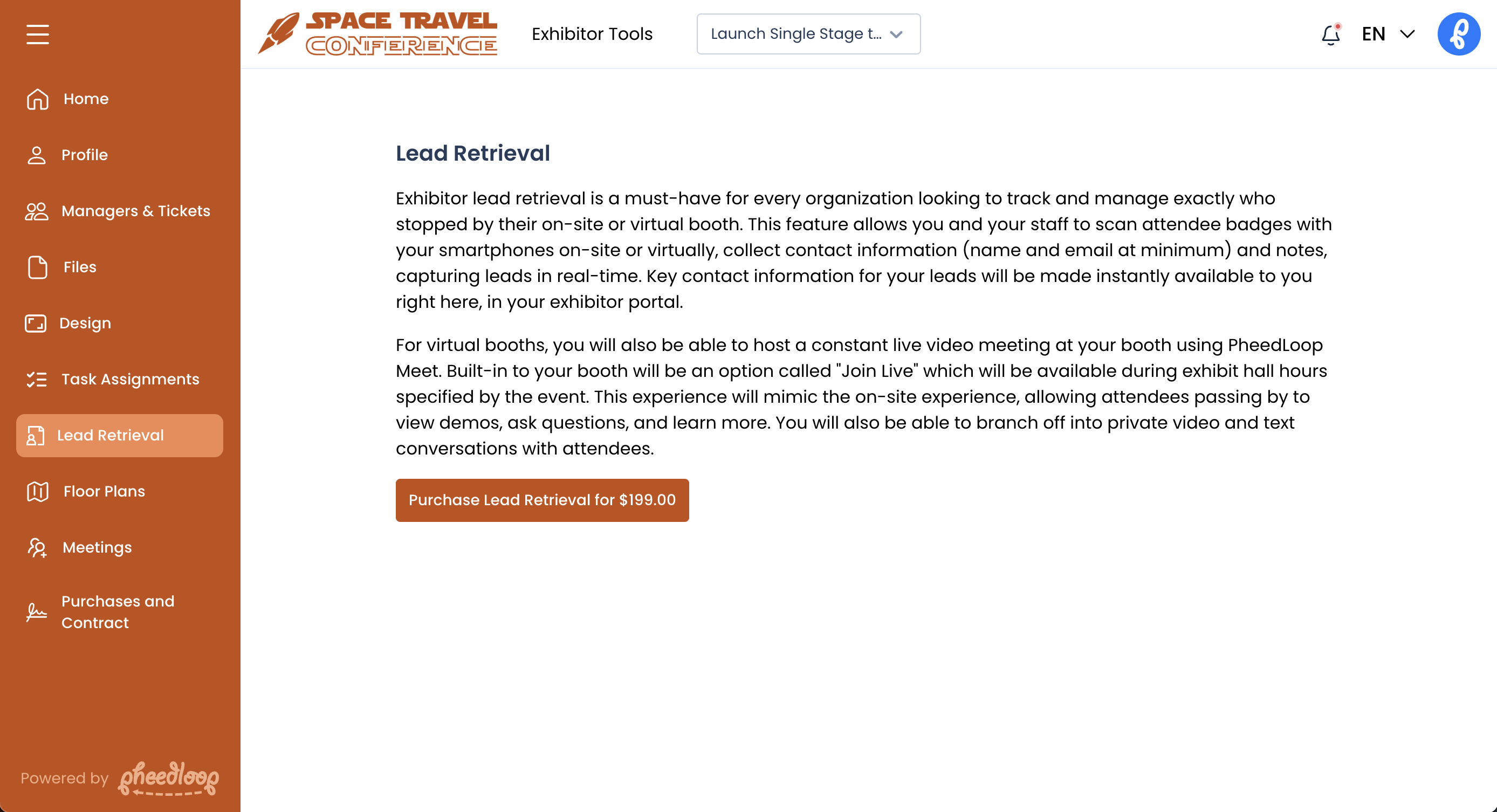 As Lead Retrieval is a paid feature, an exhibitor or event admin must pay $199 for each exhibitor to qualify. This payment can be made either from the Exhibitor Portal or Event Dashboard. Once paid, Lead Retrieval will become available to use.