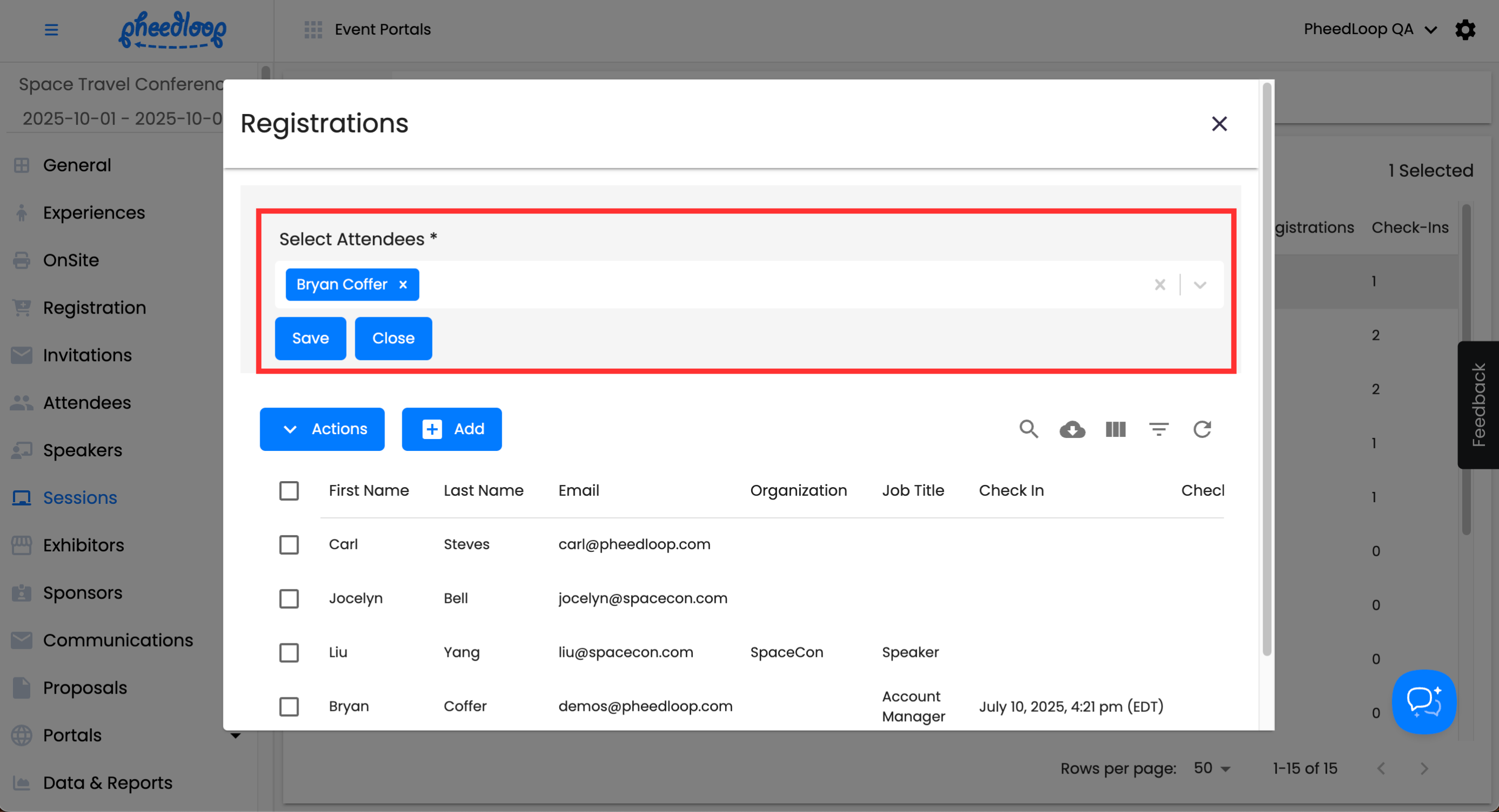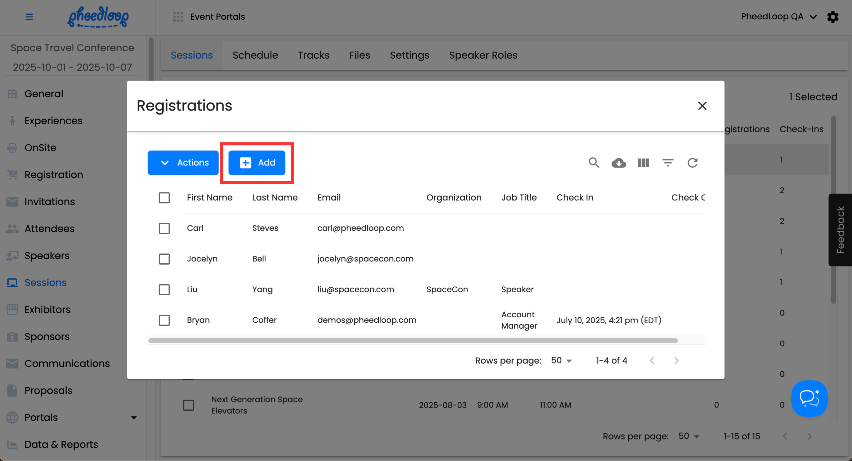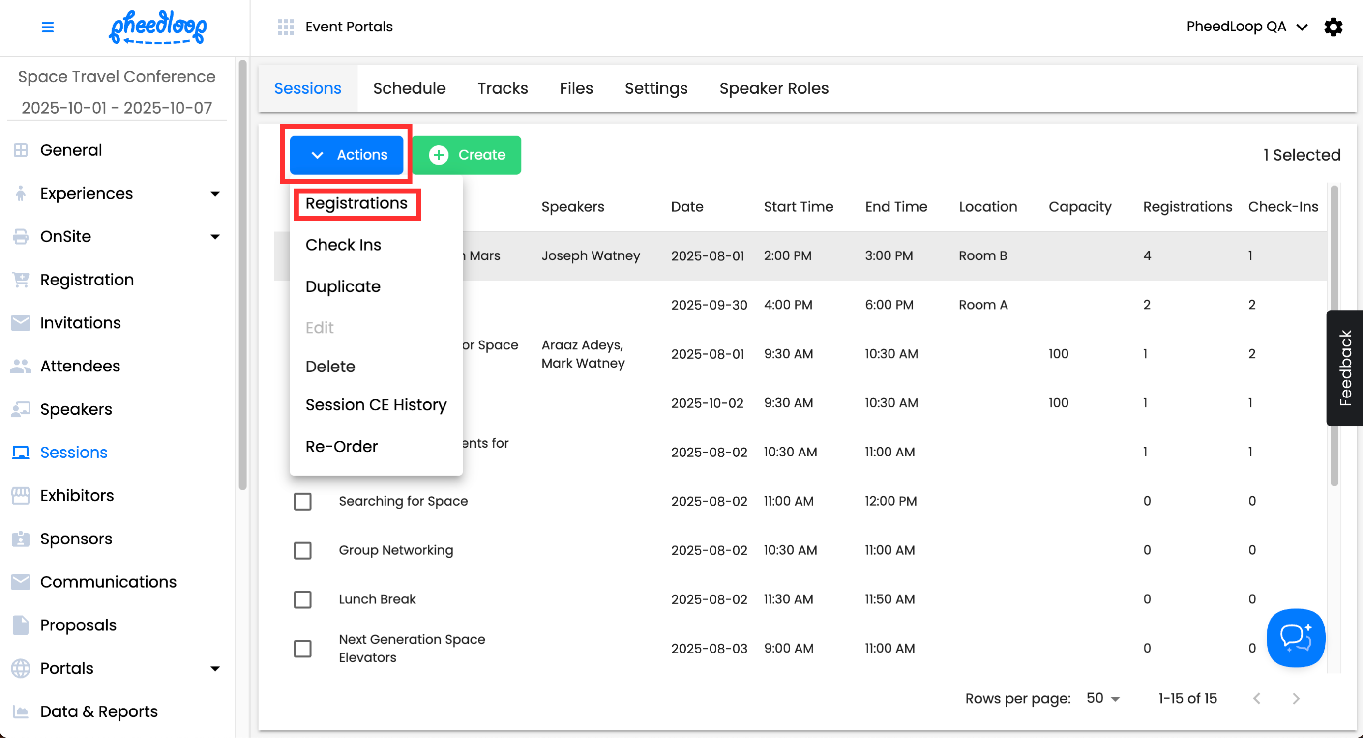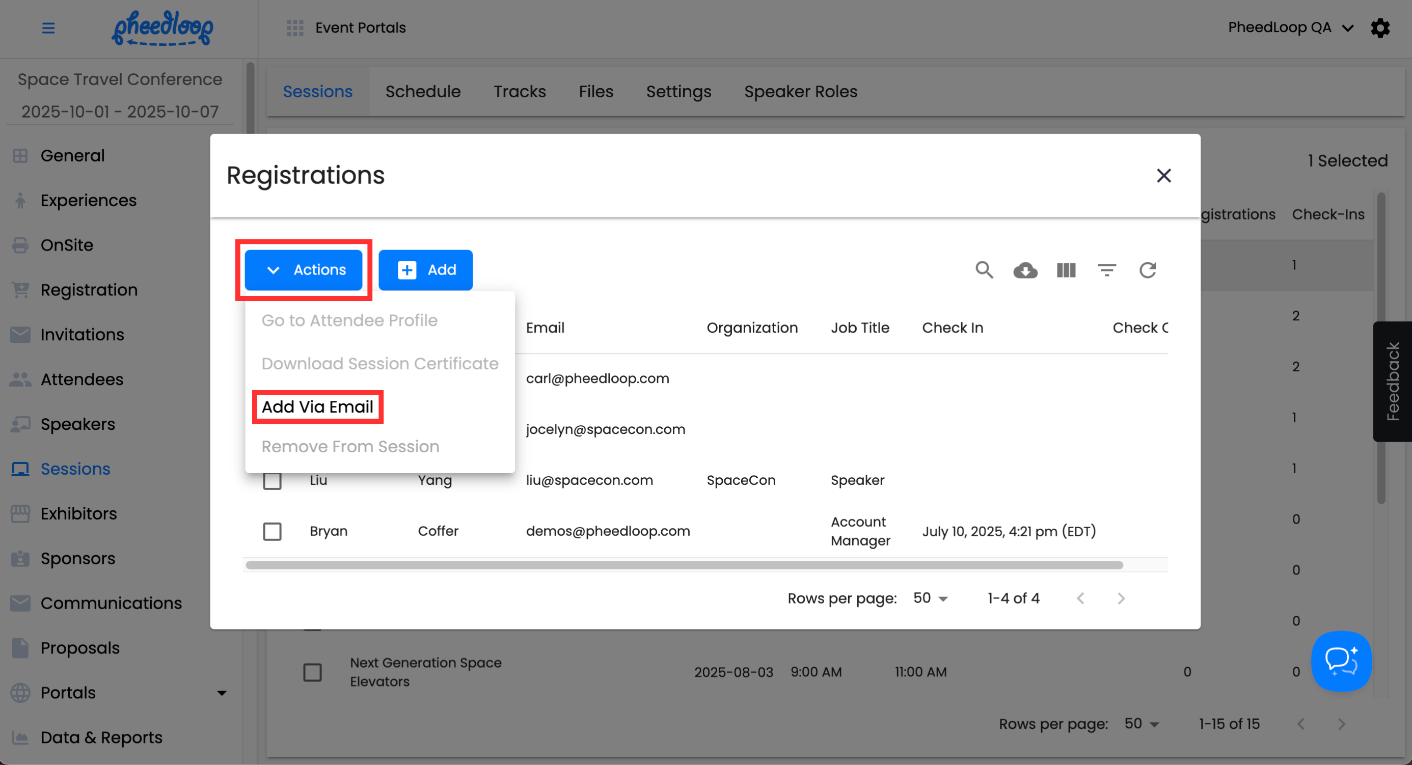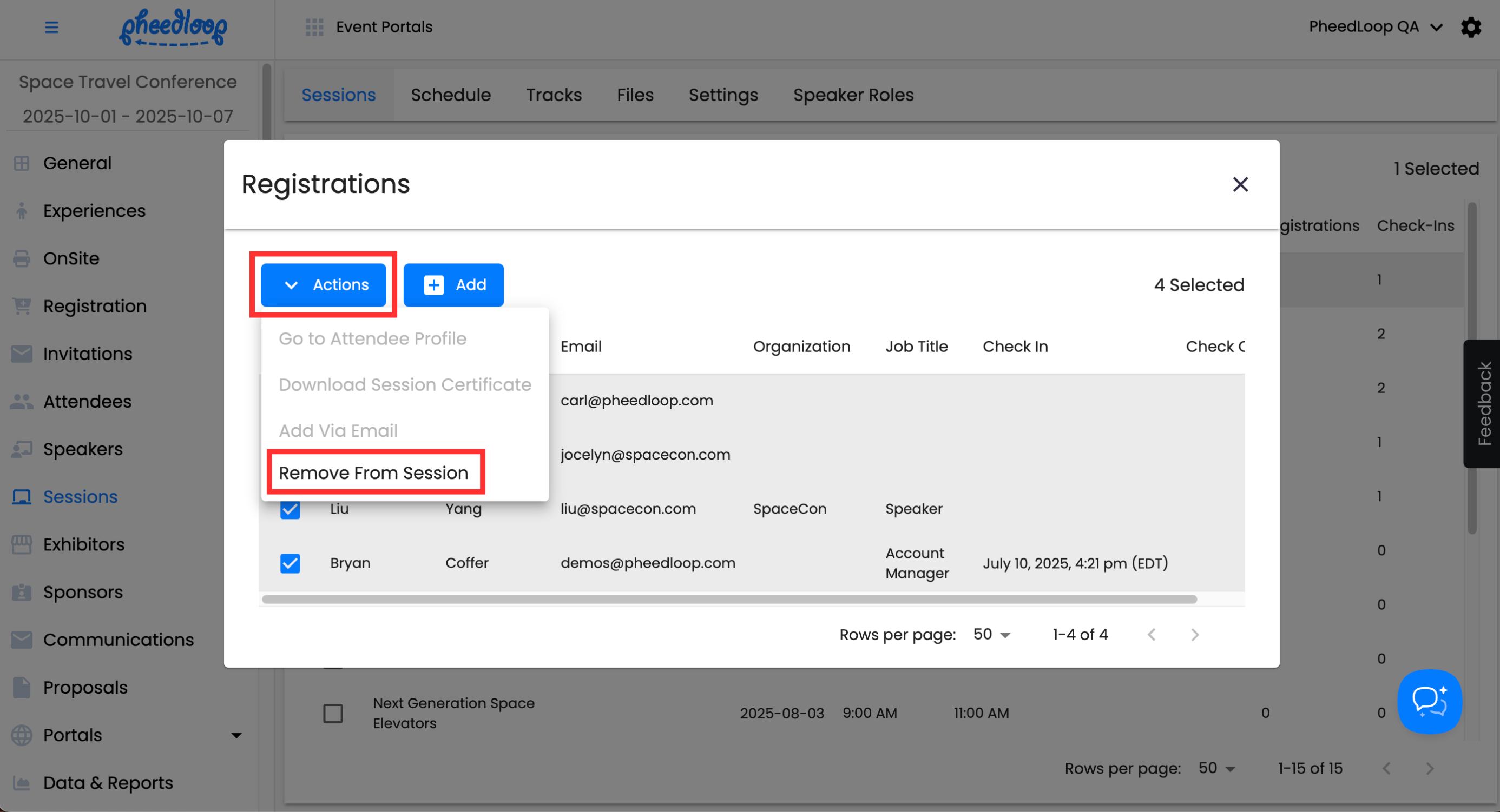 Above the Sessions table, select Actions > Registrations