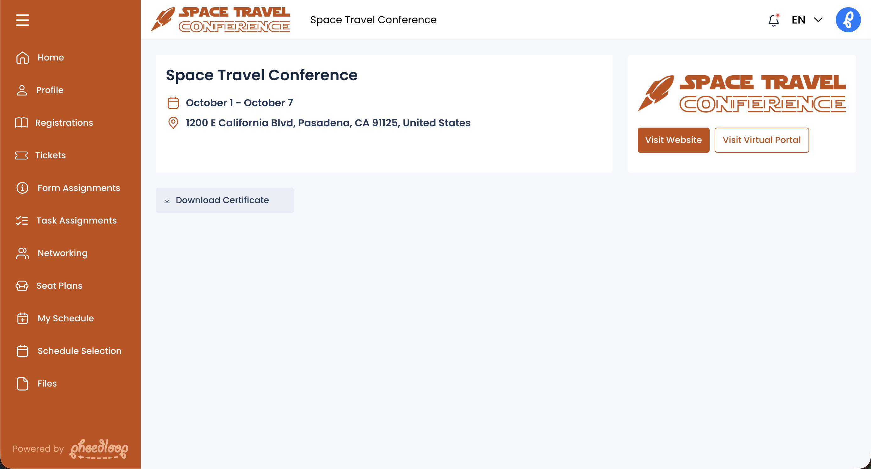 Once you log in you will be taken to the Home page, where you can view information surrounding your event as well as buttons leading to the Event Website and Virtual Portal (if configured by the Event Administrator). You will also be able to download your attendance certificate by selecting the Download Certificate button.
