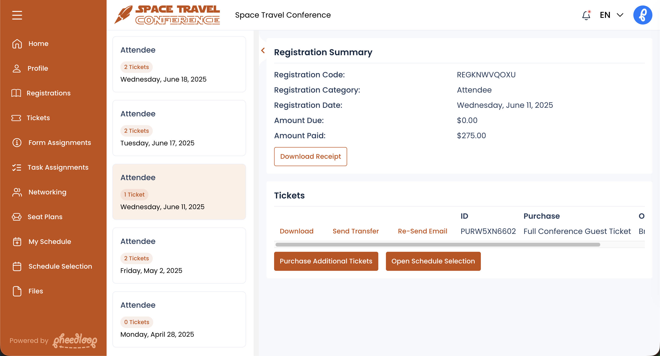The Registration and Ticketing pages contain your purchase information. The Registration page will hold your receipt/invoice along with details associated with the registration, such as date and category. Each registration will contain ticket information, which can be downloaded or transferred. You can also resend the ticket to your email if you have lost the original one.