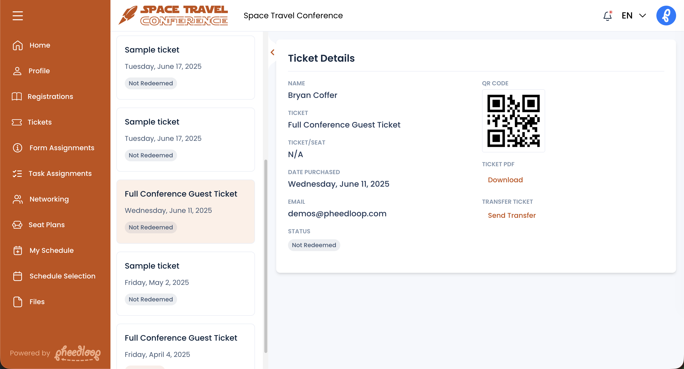 The Tickets page lists all tickets linked to your account. Unlike the Registration page, it also includes any tickets not tied to a registration directly associated with your account. If you’ve received a ticket through Ticket Transfer, this is where you’ll find it.