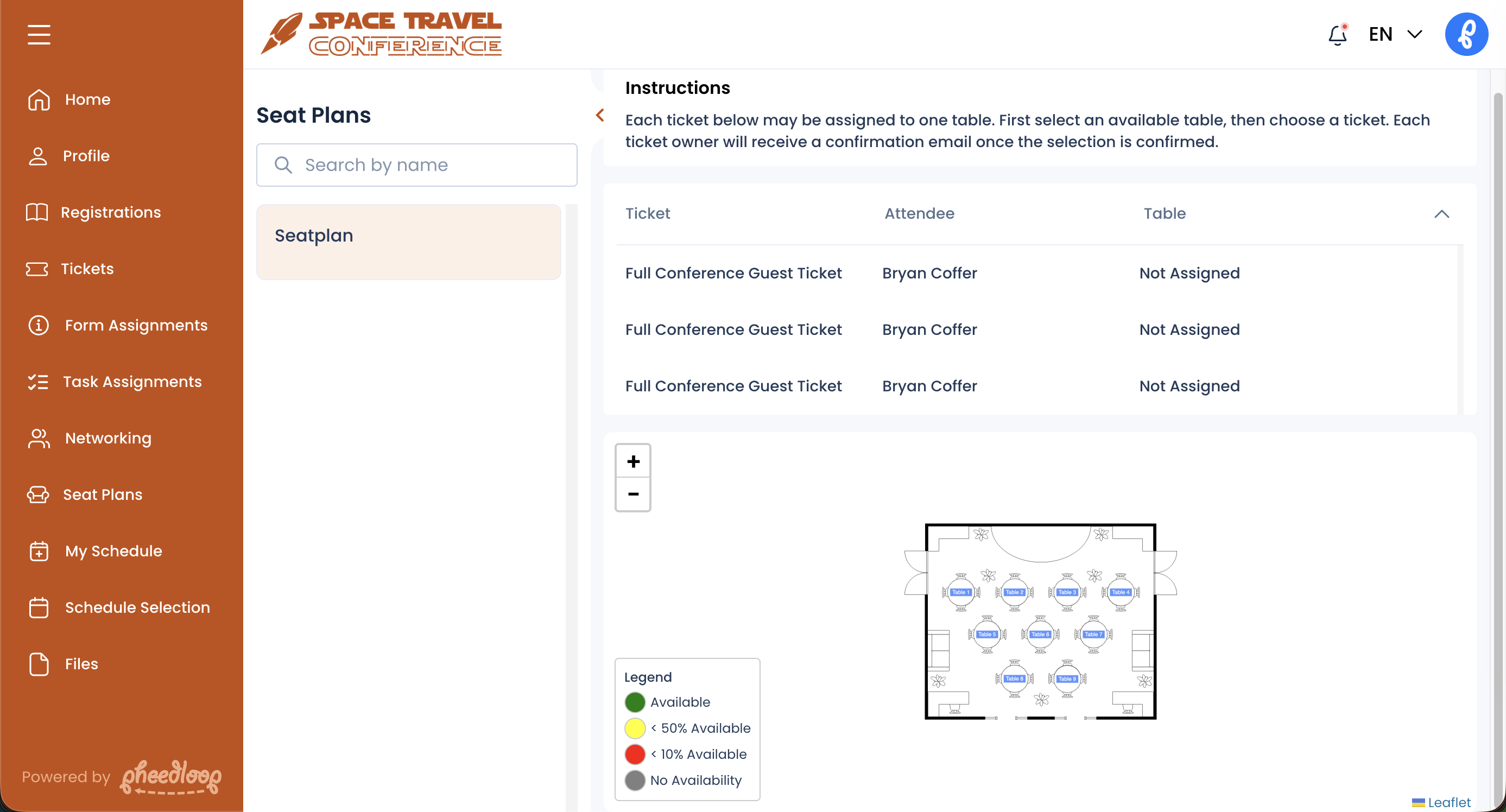 The Seat Plans page allows you to select your table if your venue is hosting dining options. Select a table and, with a prerequisite ticket, assign yourself a seat.