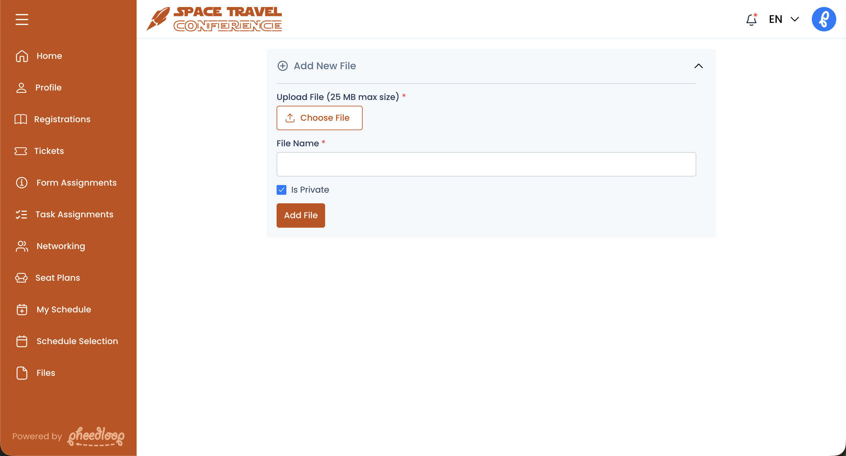 The Files page is where you can upload and review files from the Event Portal. Please note that whatever files you upload in here will be visible to the Event Administrator as well, regardless of whether the Is Private checkbox is toggled on. Select Choose File to upload your file. Once you've filled out your file name, select Add File to save it into the Event Portal.