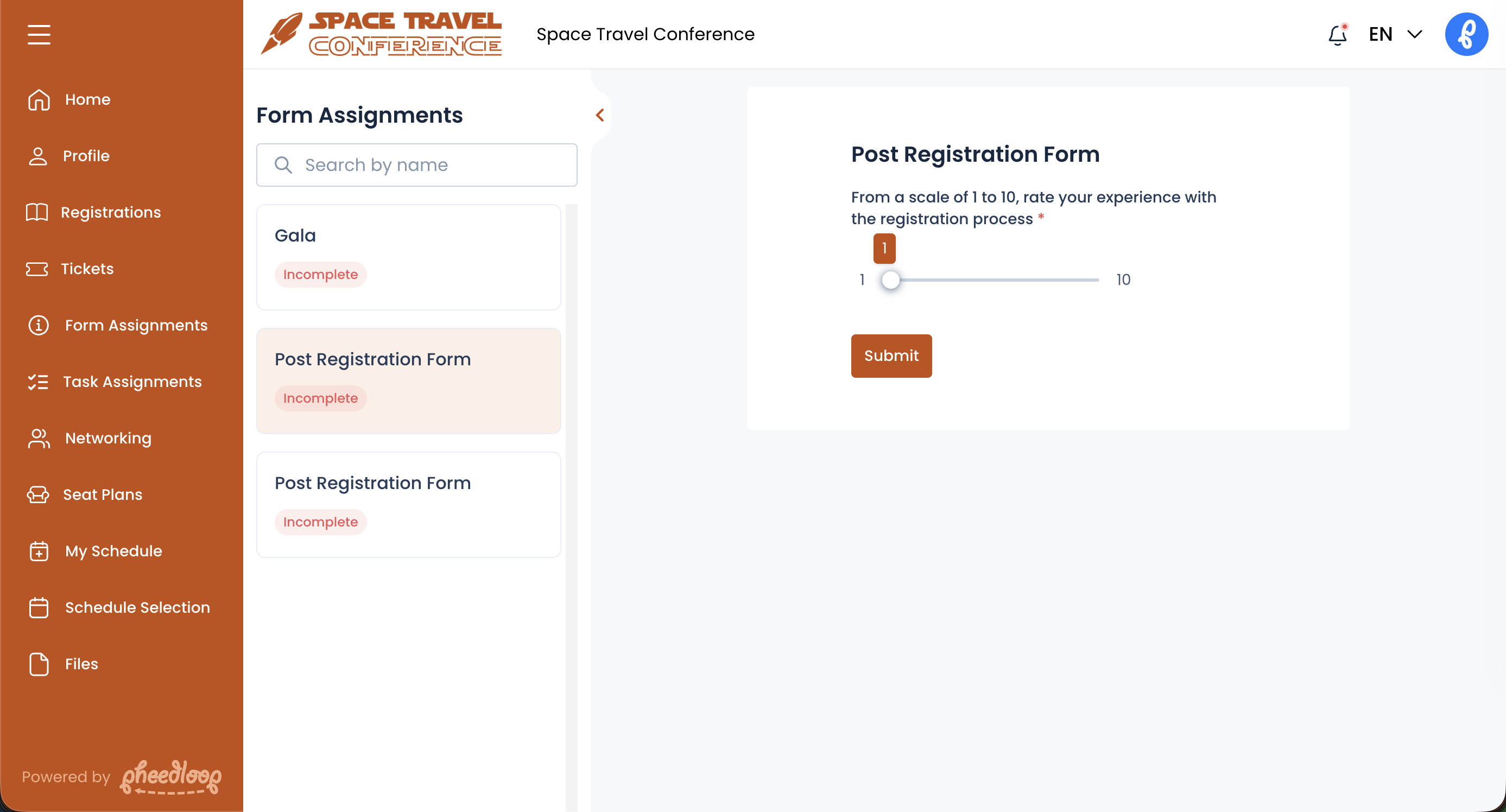 The Form Assignments and Task Assignments pages feature feedback from Event Administrators requiring your input. For example, any forms you have answered during the registration process will appear in the Form Assignments page. This includes forms associated with the registration category and tickets.