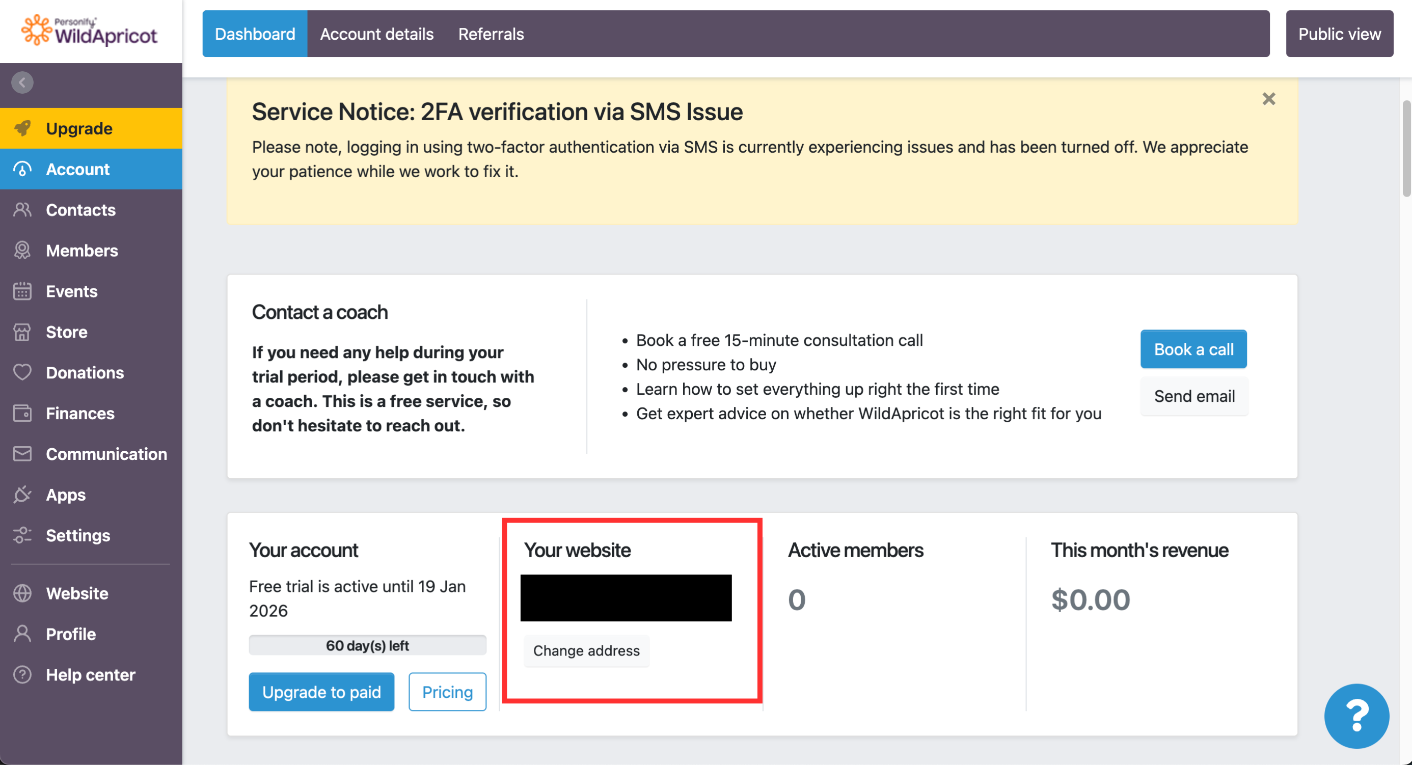 The Authorization URL requires some additional set up. First, you will want to go to the Account Dashboard in Wild Apricot and note the website address you are using.