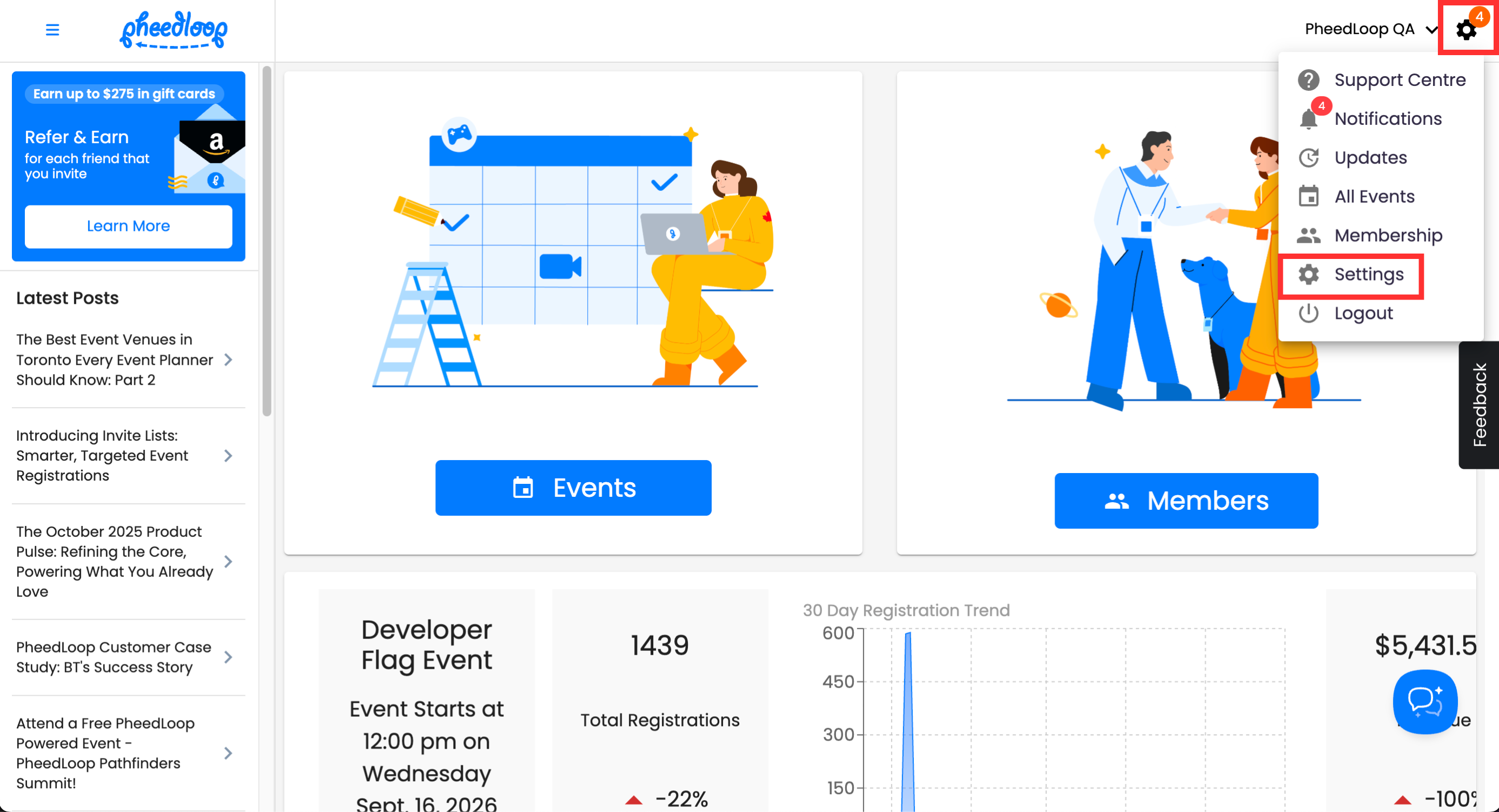 Log in to your Event Dashboard on PheedLoop and select the gear icon followed by Settings