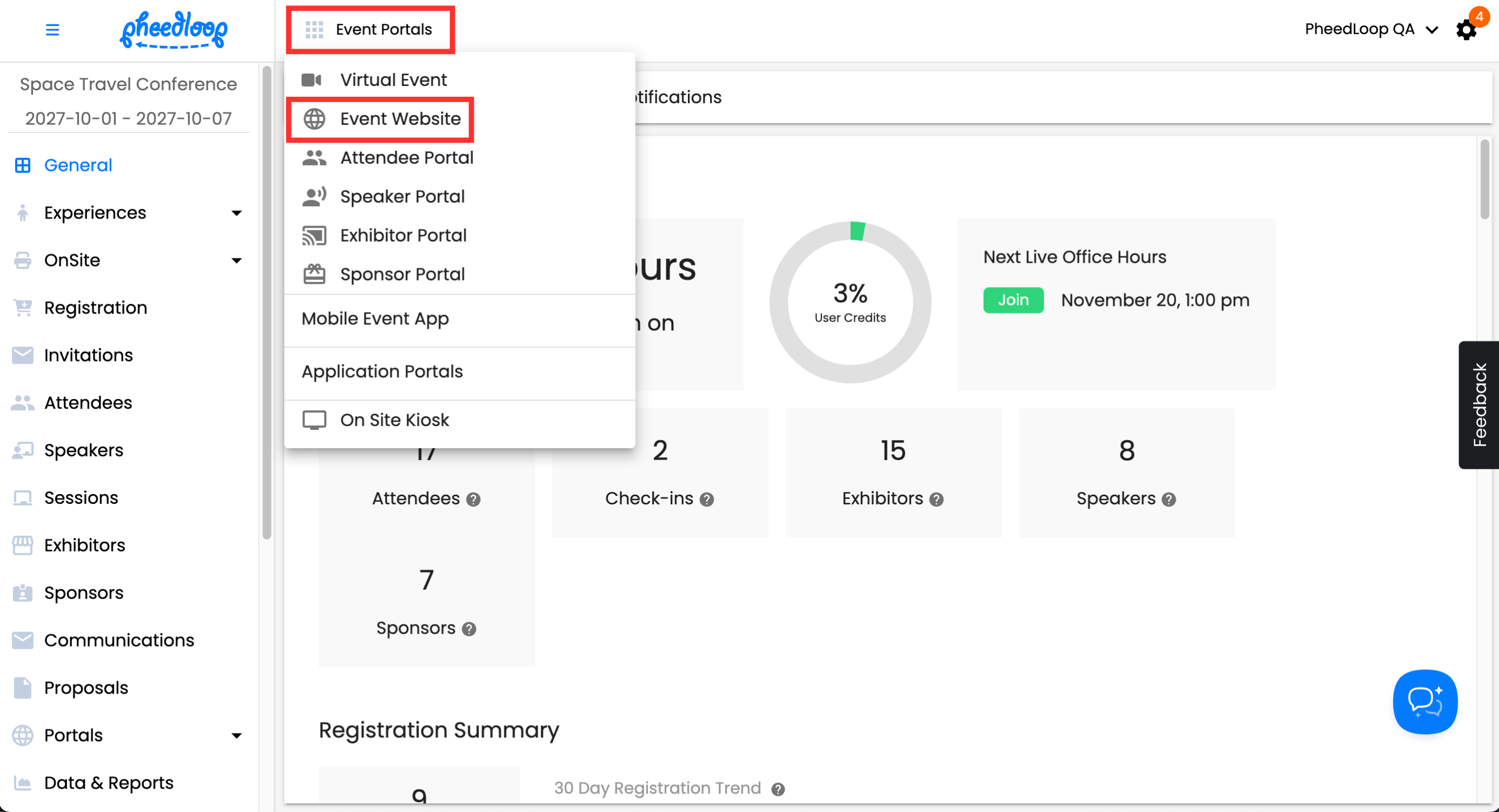 To ensure everything is working, we recommend doing a quick test from the Event Website. This is where your attendees will purchase their tickets and complete their registration information. You can open the Event Website from the Event Dashboard by selecting Event Portals > Event Website