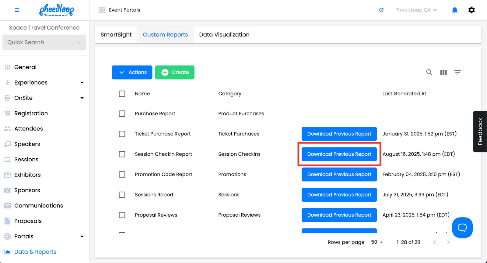 After your event has concluded, you can easily gather all your attendee data with our custom reports feature. The exact report you will want to download will vary depending on whether your event is virtual or in-person. This article focuses primarily on the Session Checkins Report Type, which is used for In-Person events.