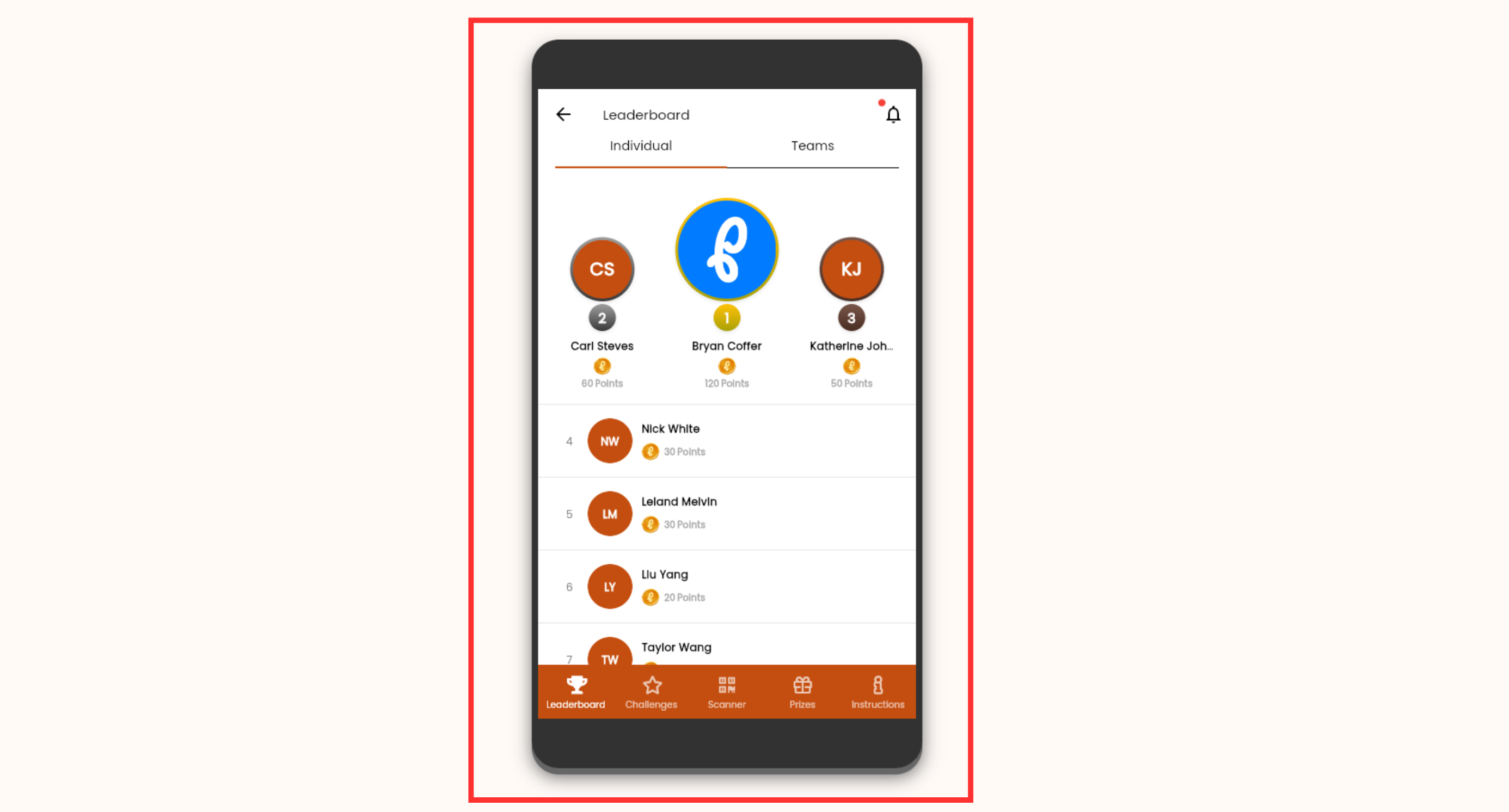 The Leaderboard section will list the points of all participants in descending order. The top three participants will be featured at the top of the page.