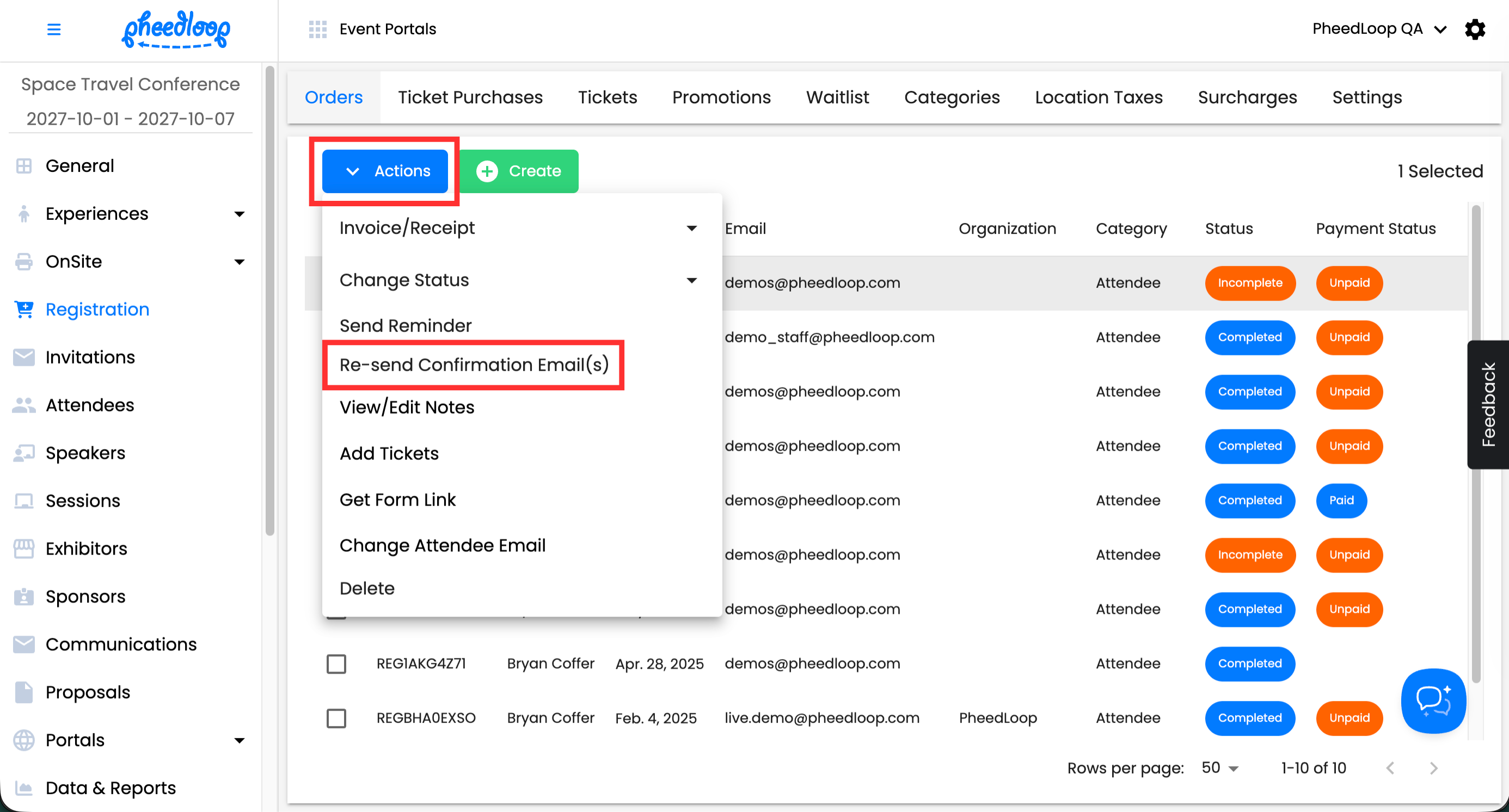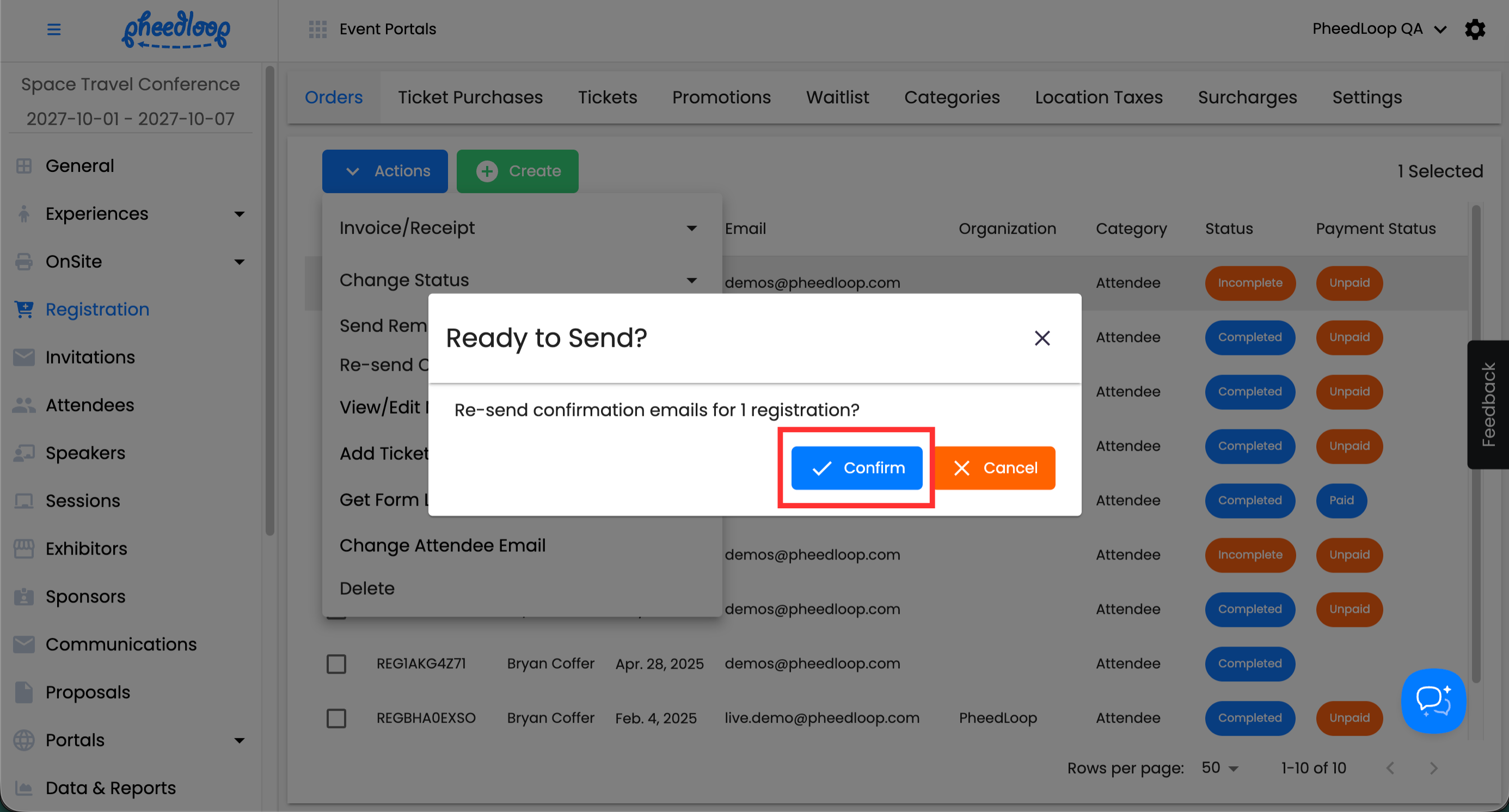 Registration confirmation emails can be resent from the Event Dashboard. You can notify one or multiple orders at once. Emails are sent to all registrants within the order, including the account holder who created the order and all email addresses assigned to tickets.
