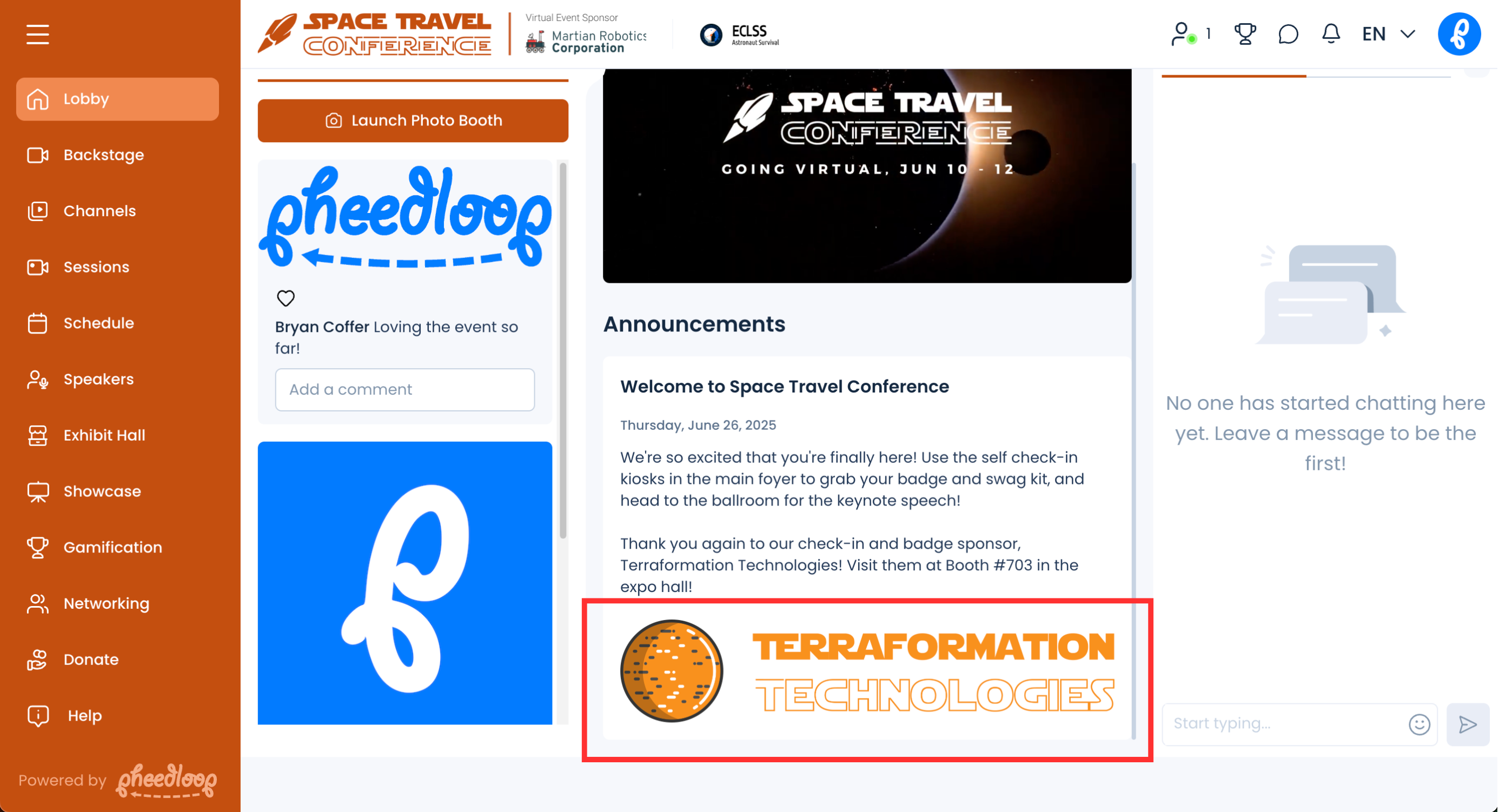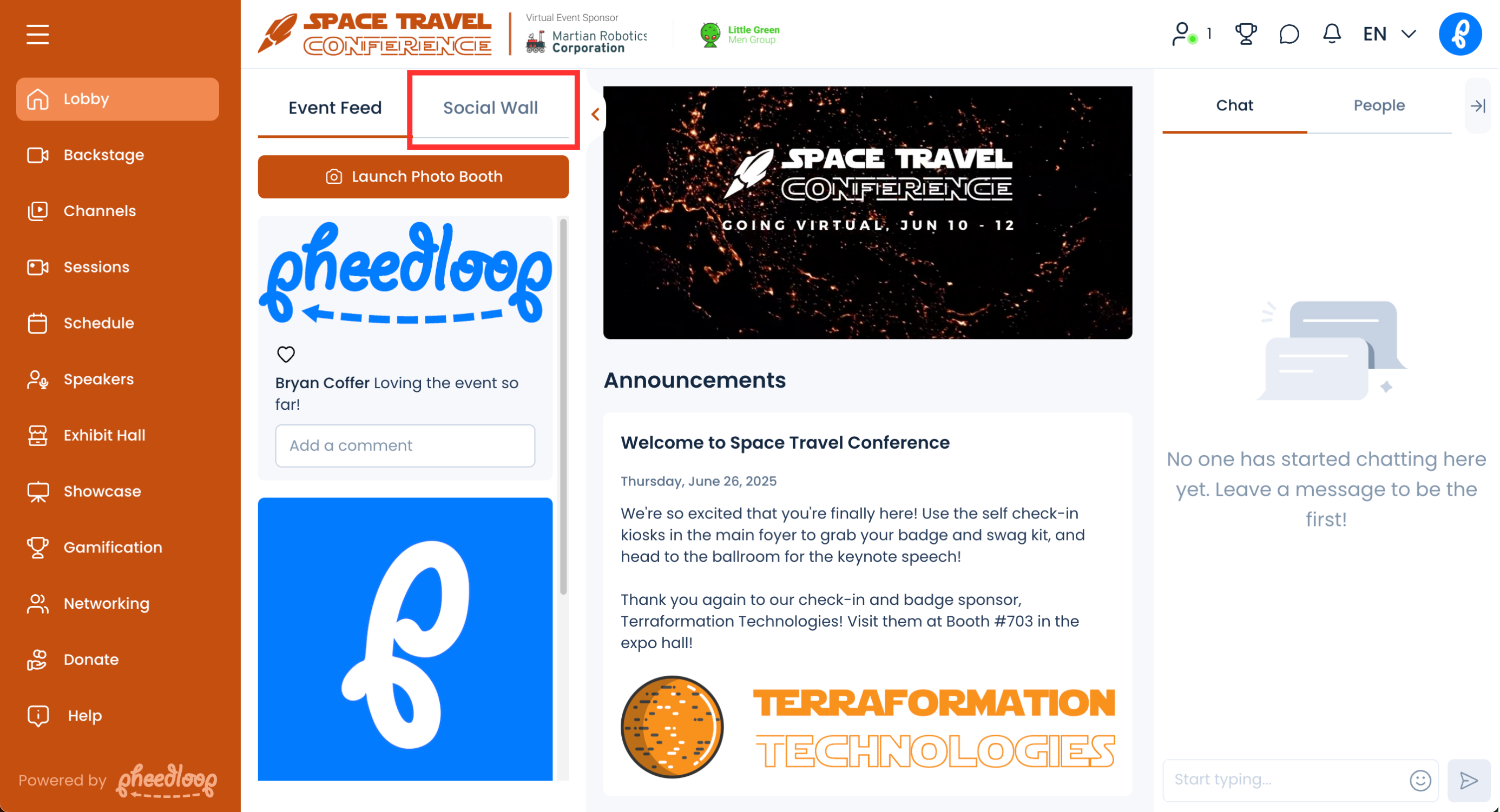 PheedLoop's virtual event lobby has a pretty slick and nicely integrated social media feed. You're likely already promoting sponsors on social media channels, so you have the added benefit of seeing those sponsored social media posts flow into PheedLoop automatically. A perk many sponsors find quite attractive. To learn more about how you set up the social media feed, please refer to our How can I integrate the Curator Social Media Feed into the Event App or Virtual Portal? article.