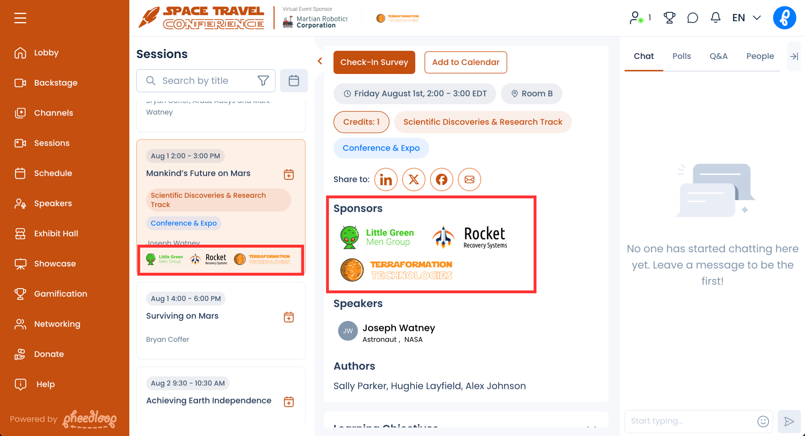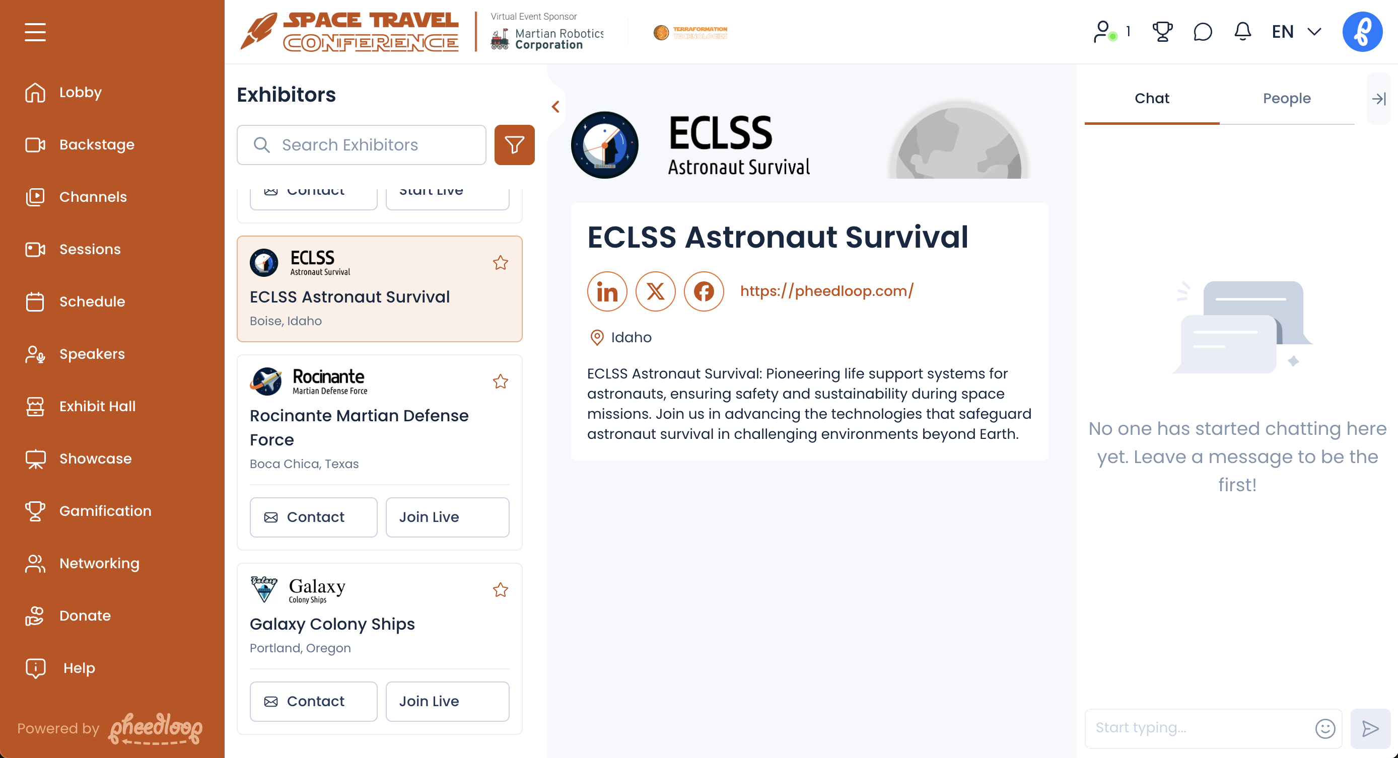 The exhibit hall is an awesome place to list all your sponsors and exhibitors because it allows you to create a dedicated space where each organization can express themselves with more graphics, videos, files, and dedicated conversations (group/private video meetings, group/private text chat). You simply need to add these sponsors as exhibitors via the Exhibitors module in your PheedLoop dashboard. You can drag to re-order them in any custom way you want, and you can even offer exhibiting sponsors the full ability to manage most of their presence as a connected sponsor.