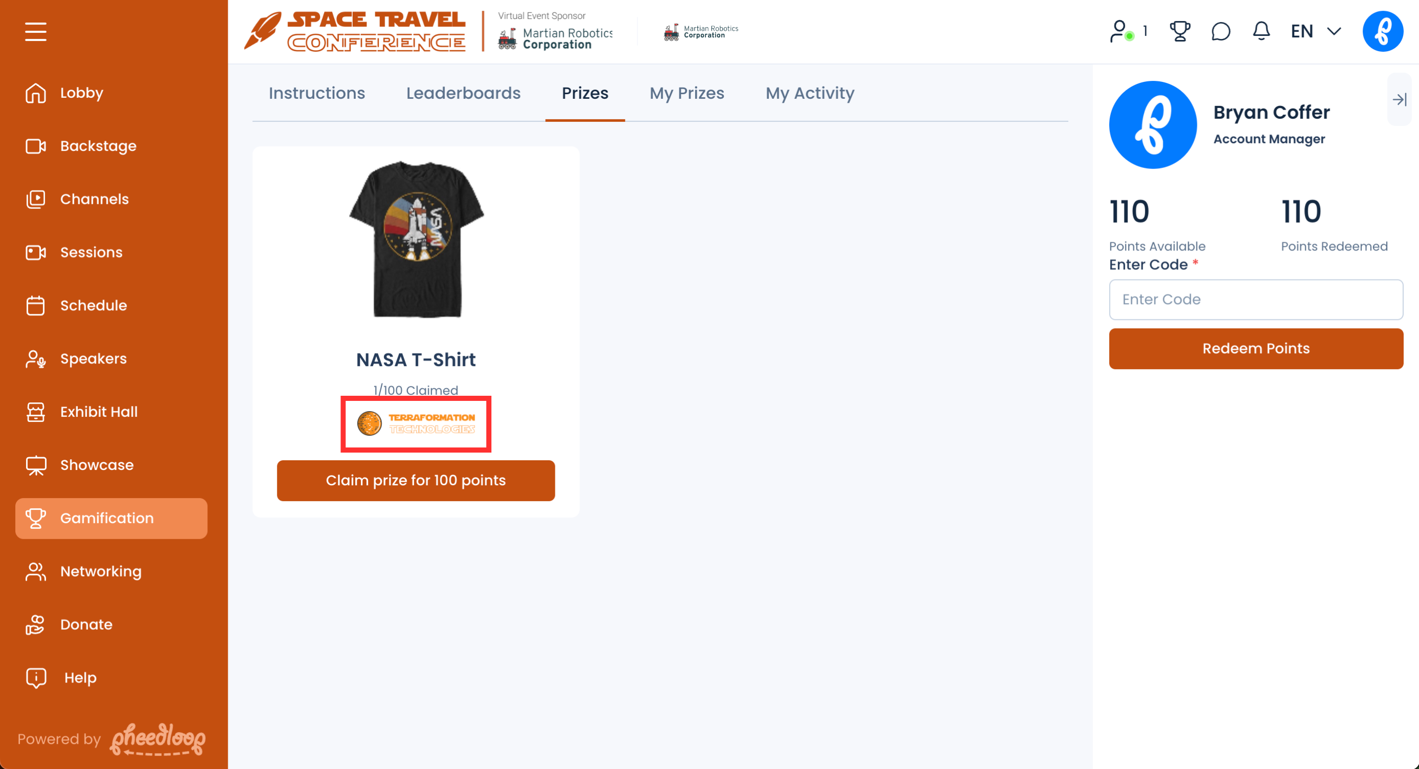In PheedLoop's virtual event gamification system, attendees claim points they earn for prizes. Another way to draw more exposure to your sponsoring brands in the gamification system is to associate prizes with sponsors (or maybe have sponsors donate prizes). Each prize has the option to include a description and image, so it's very easy to pop in the sponsor's logo onto the prize's image. Explore this article for more information about gamification.
