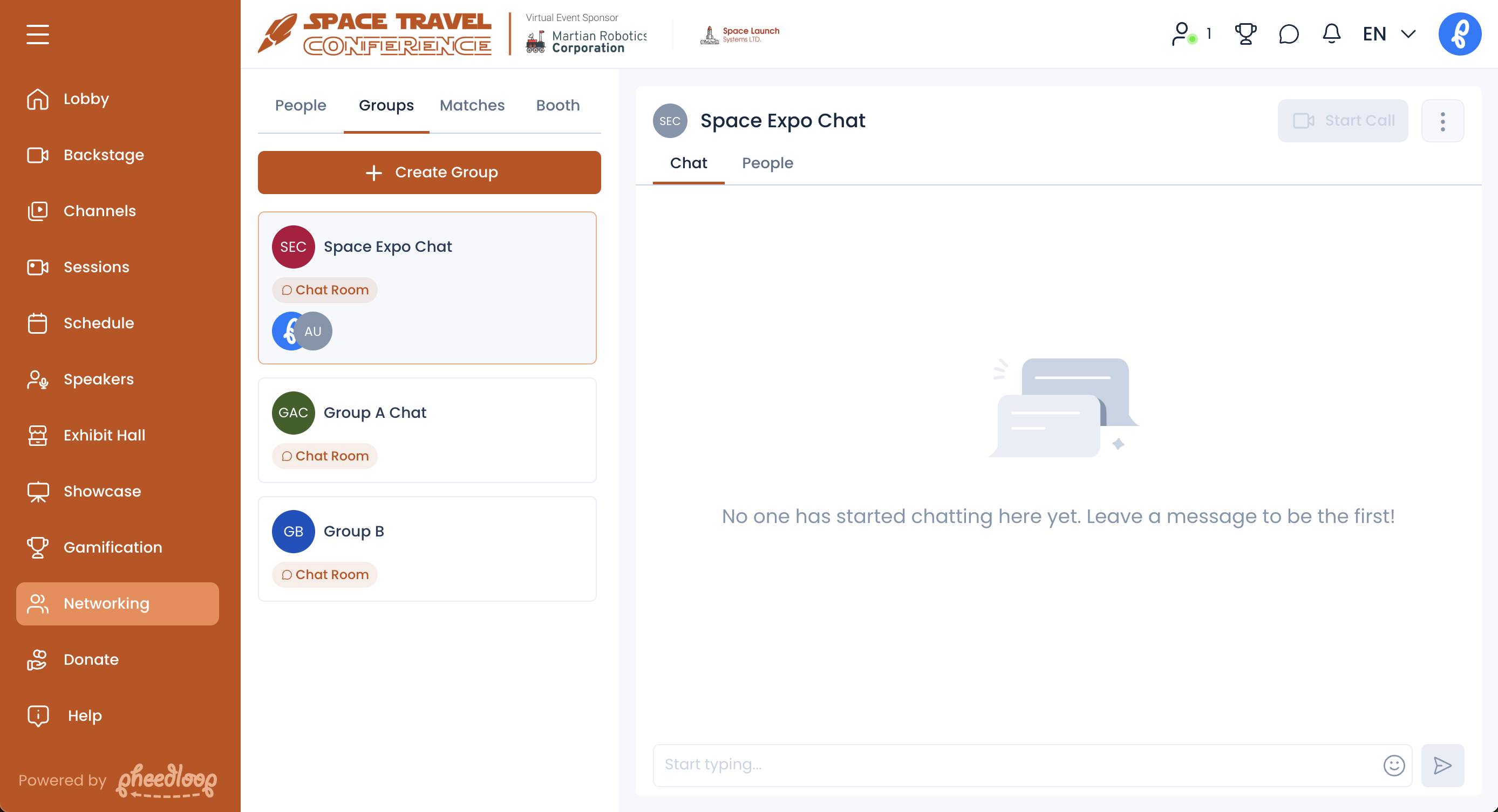 Group networking rooms are an excellent way to get large numbers of attendees to congregate around and discuss specific topics. We've seen countless events be quite successful with creating rooms specifically for sponsors on themes or topics which position the sponsor as a thought leader. It's less effective to have a group networking room called "Learn More About XYZ Company", as the first impression for an attendee looking for a group to join is going to be one of hesitation thinking that it will be more of an advertisement than an educational experience. Instead, creating groups that demonstrate a sponsor's thought leadership and authority such as "Learn 15 Amazing Marketing Tips from Pepper Potts, CEO of Stark Industries", will yield a lot more interest and traffic.