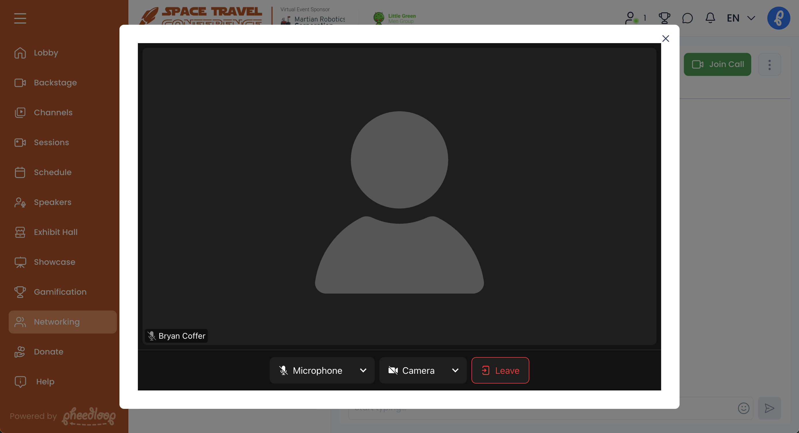 To partake in the video or audio chat, once inside the group, simply clicking on Join Call will pull up the familiar PheedLoop Meet interface, and allow attendees to join in a live meeting experience (allows for screen sharing also).