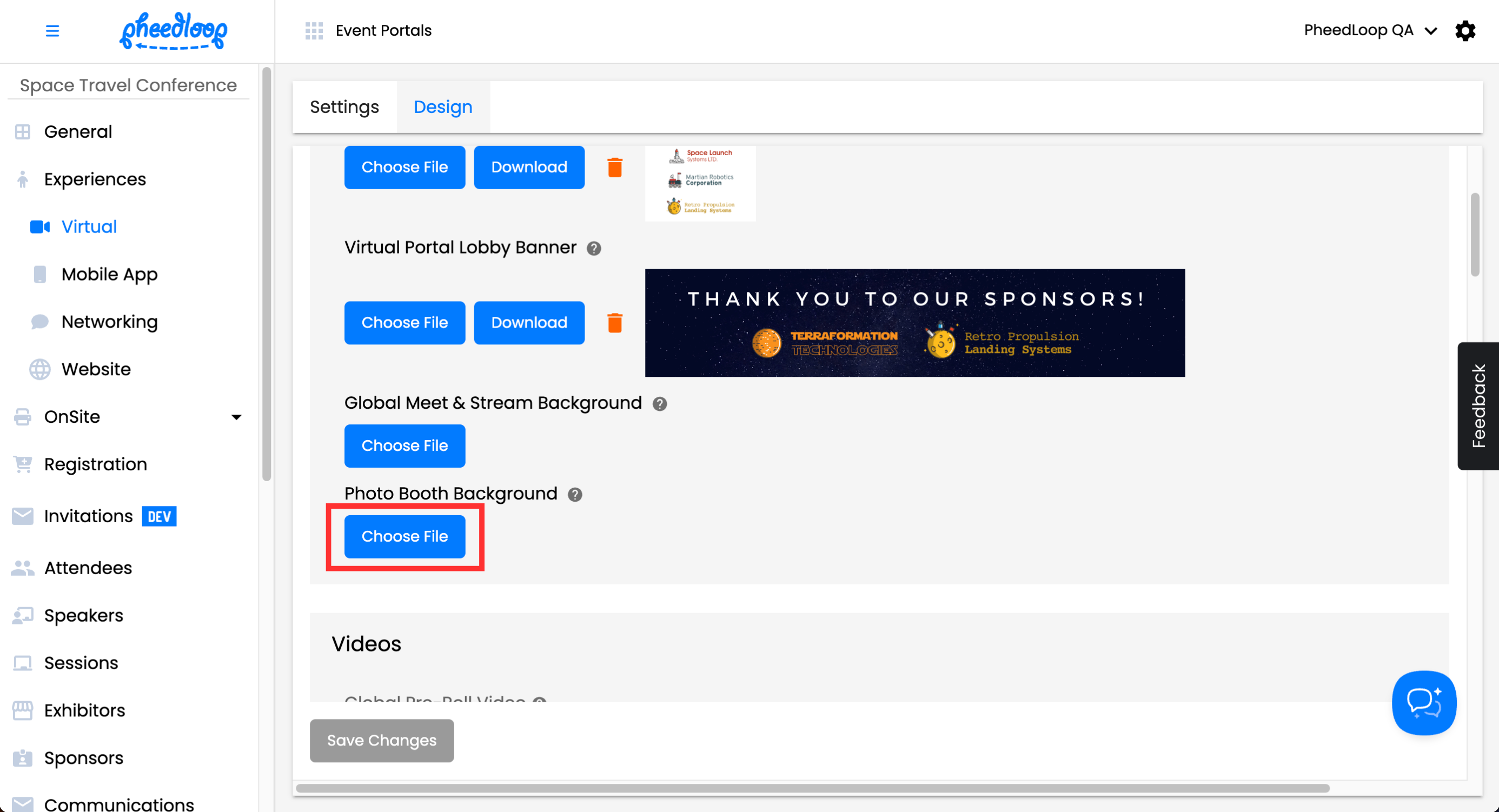 You have two options to upload custom Meet & Stream backgrounds, they can both be used or only one of them. The first one is the option to upload your image as a global image (i.e. will auto-apply to all future session broadcasts via Meet & Stream without adding images to individual sessions). This is accomplished via the Experiences > Virtual > Design > Global Meet & Stream Background image field.