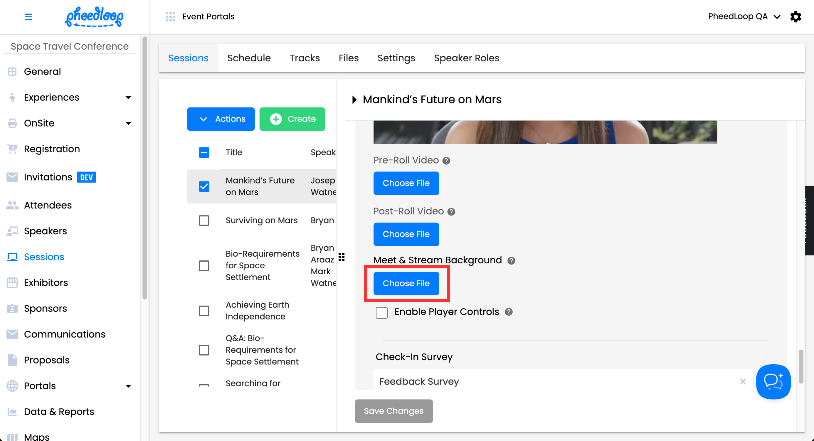 The second option is to upload individual images to sessions. When editing a session, visit the session's Virtual Settings and upload an image to the Meet & Stream Background image field. If you have a global image uploaded already, the image you upload for a specific session will take precedence.