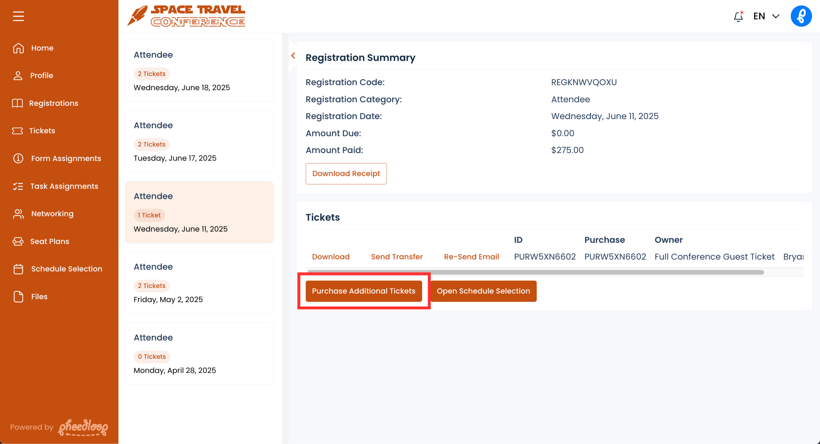 - Select the registration associated with additional ticket purchases from the list