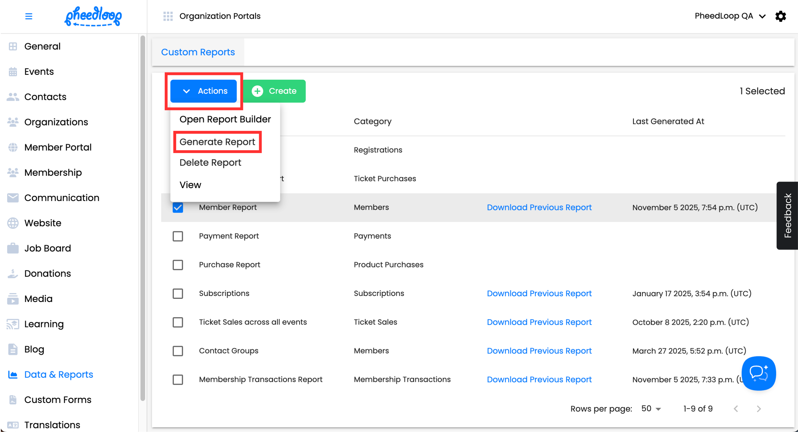 Above the Custom Reports table, select Actions > Generate Report