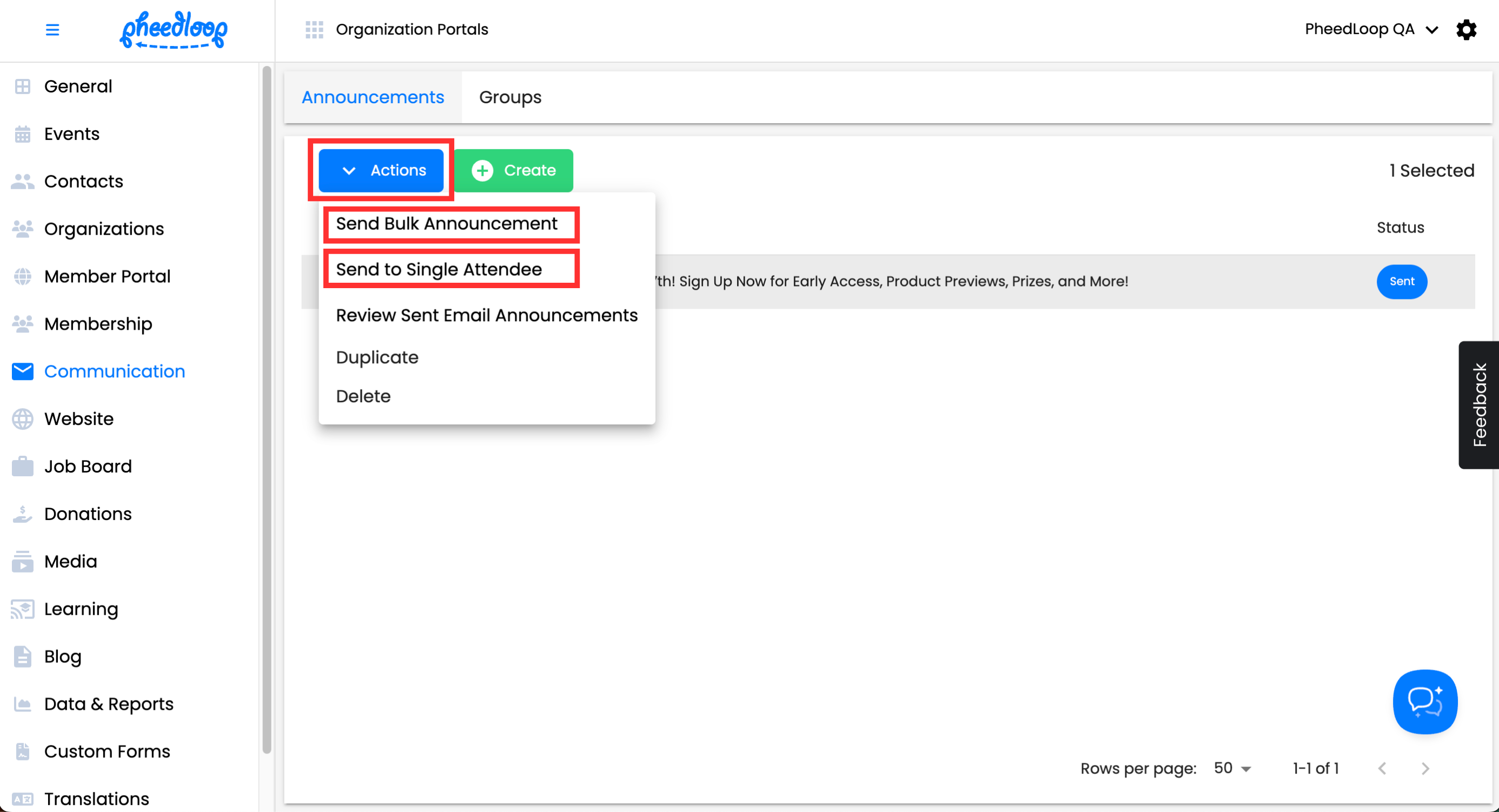 Select Send to Single Attendee to send the announcement to one member of your organization.