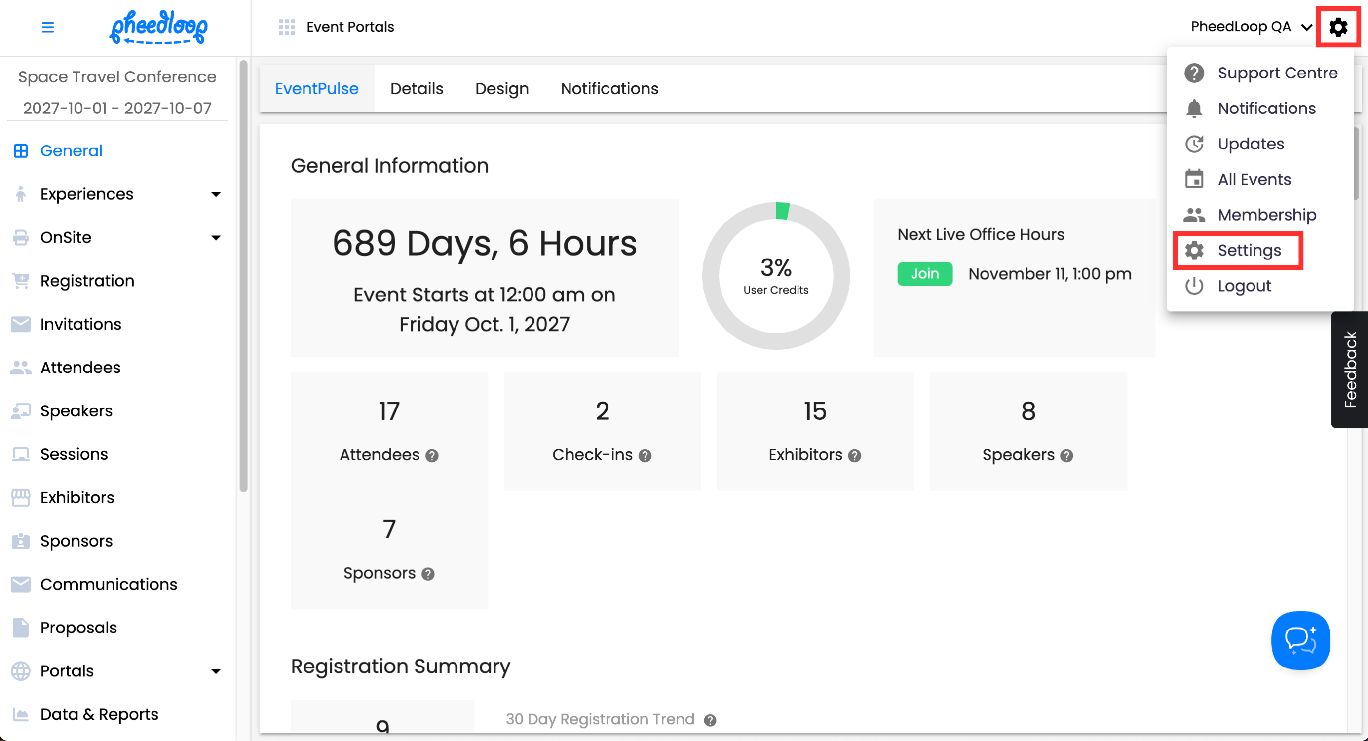 From the drop-down menu at the top right corner of your Dashboard, select Settings