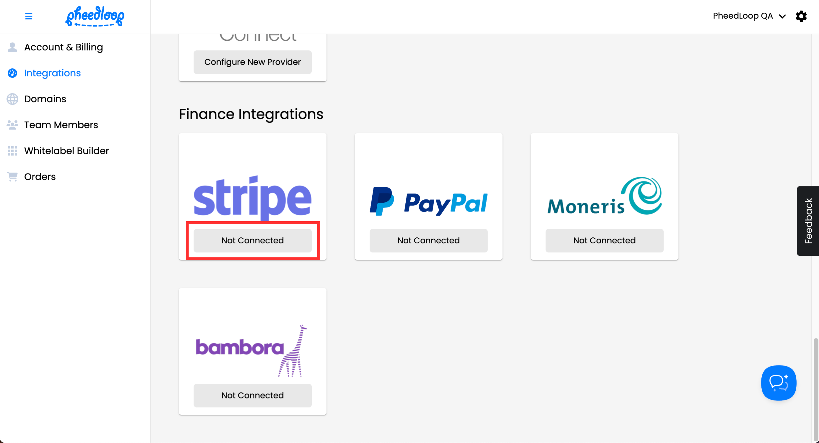 - Navigate to the Integrations tab and scroll down to Finance Integrations