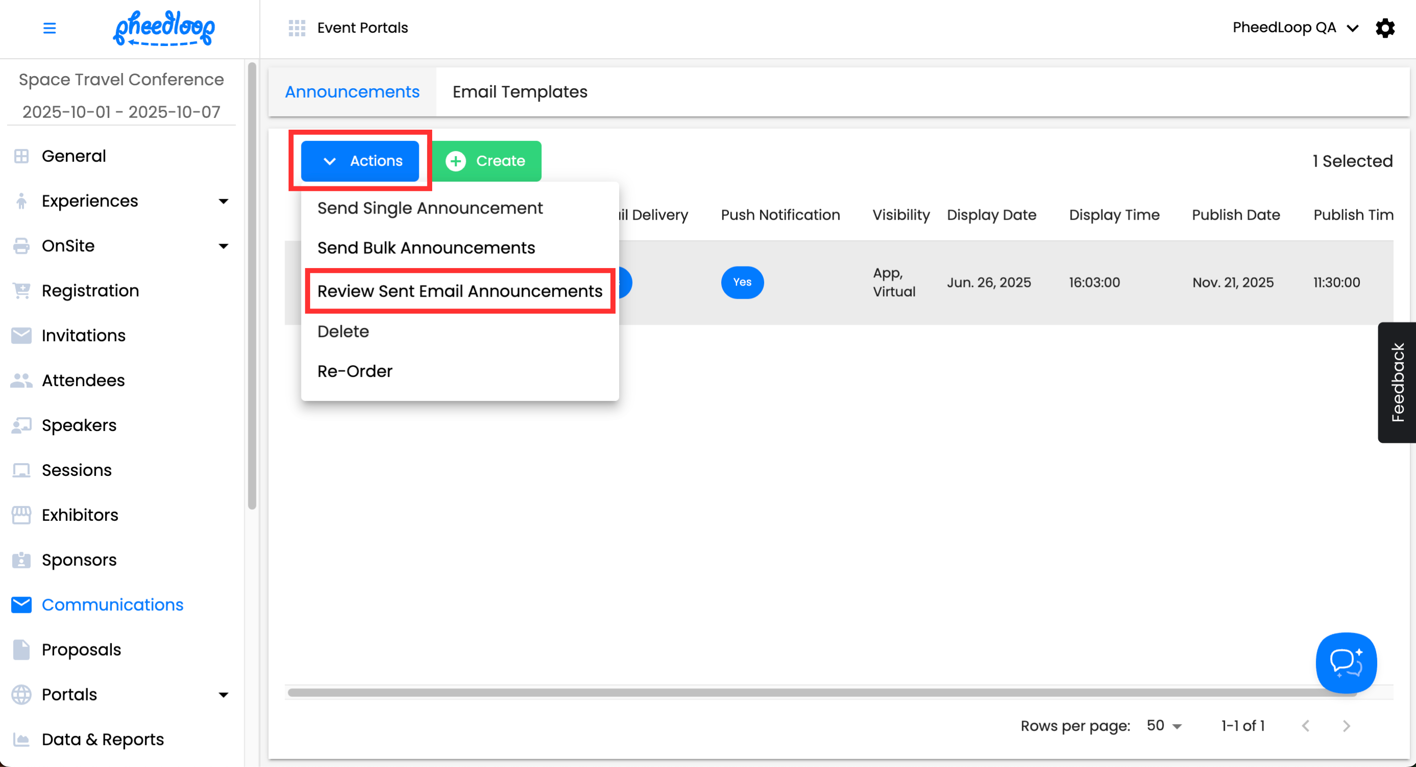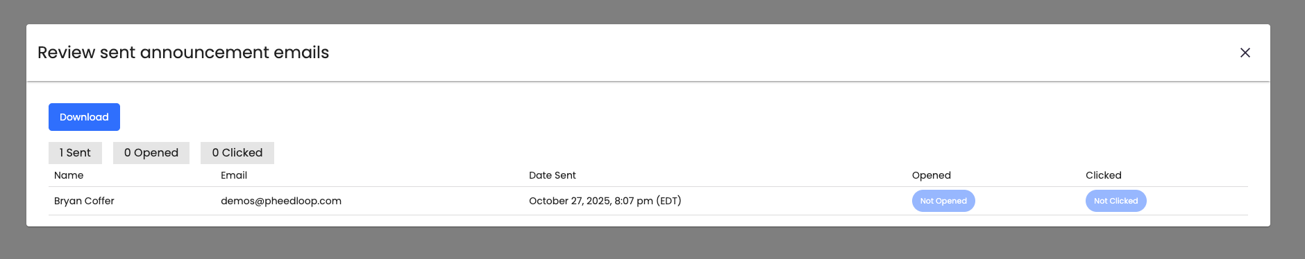 Above the Announcements table, select Actions > Review Sent Email Announcements