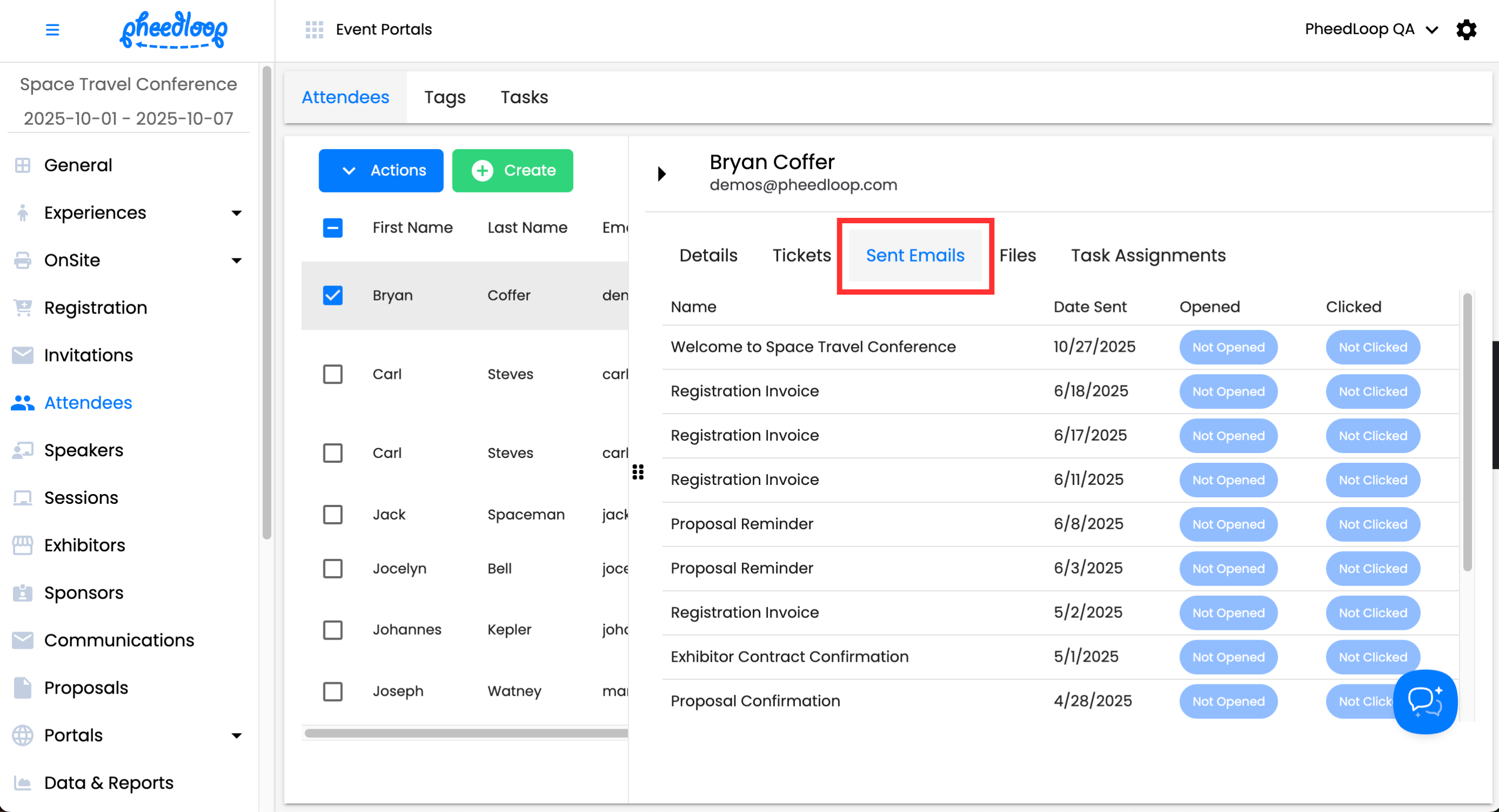 Sent emails can be reviewed from the Attendee page for convenience. This is a great way to review sent emails to specific attendees.