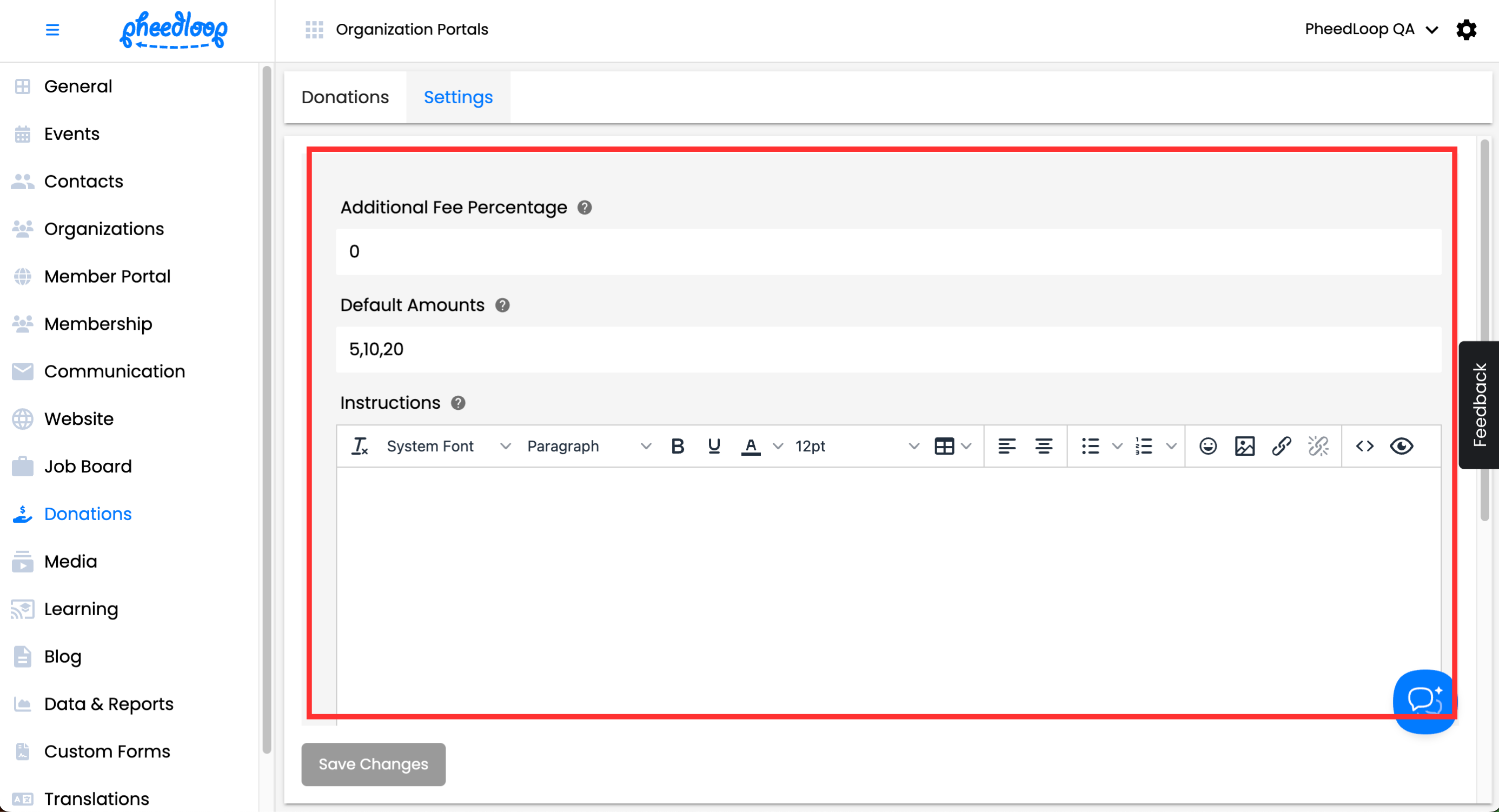 - Under the Default Amounts field, enter dollar amounts for Members to choose from in the donation page. The amounts must be divided with commas for the amounts to be displayed.