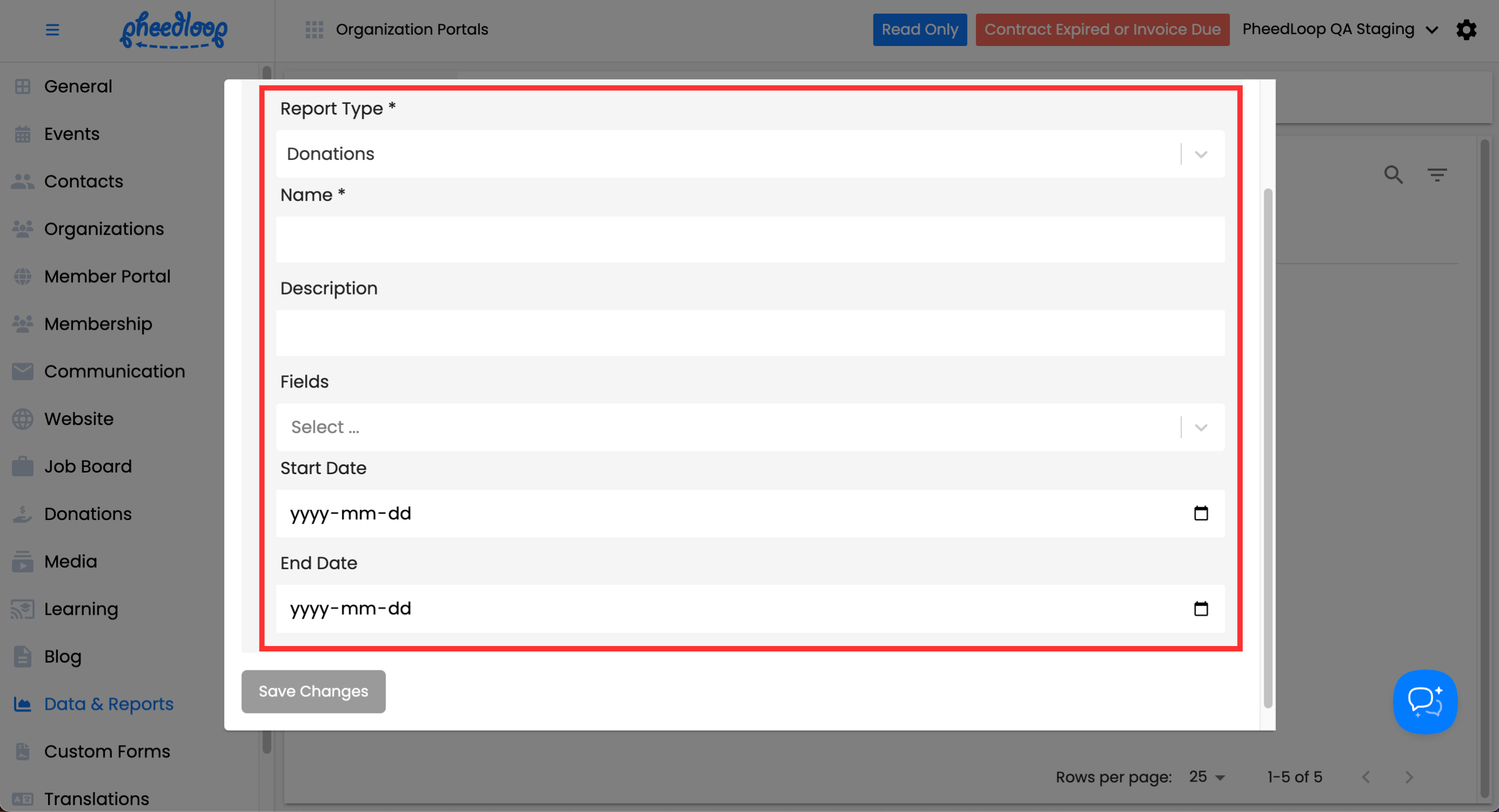 - Under the Fields field, select any information you wish to include in your report such as Member information, donation amount, comments, and much more.