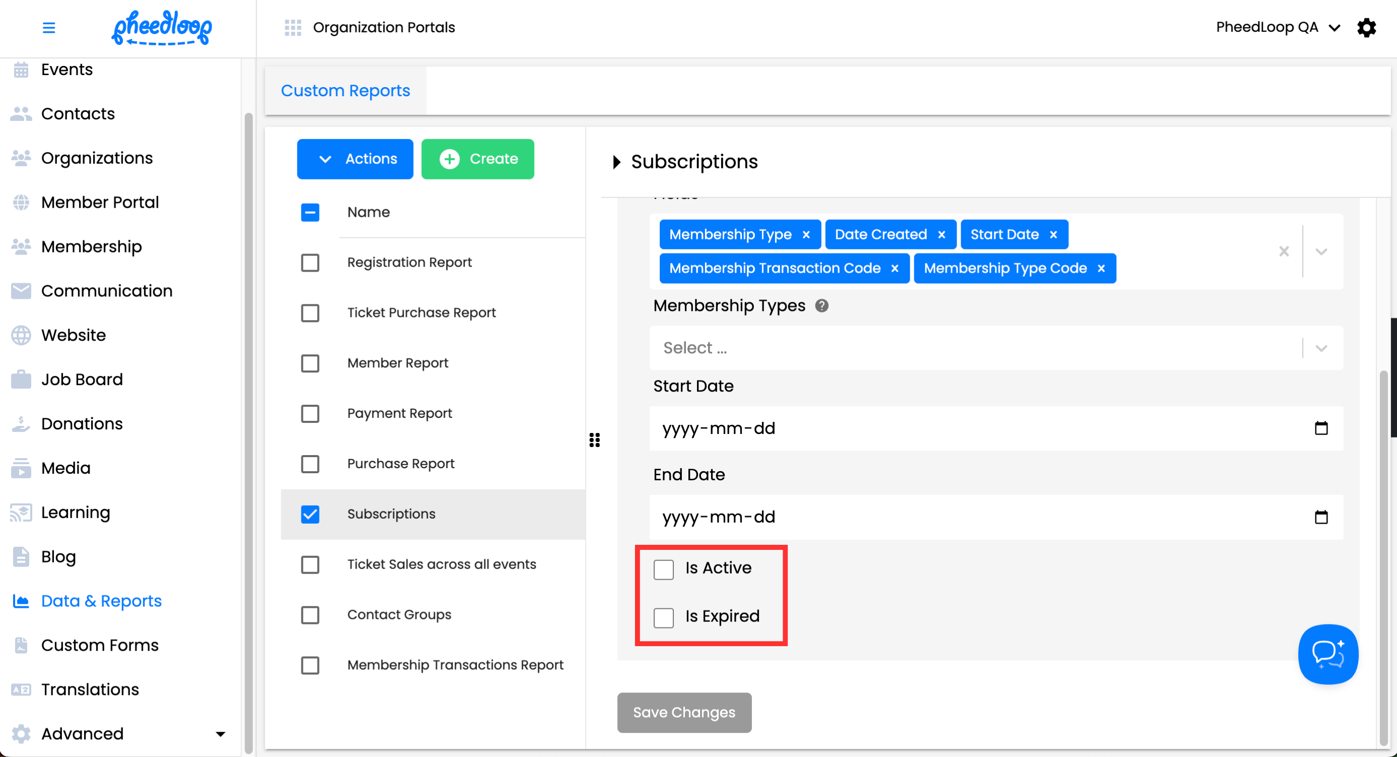 Toggle on the Is Active checkbox to only include subscriptions that are currently active in the report. Toggle off this checkbox to not filter any results.