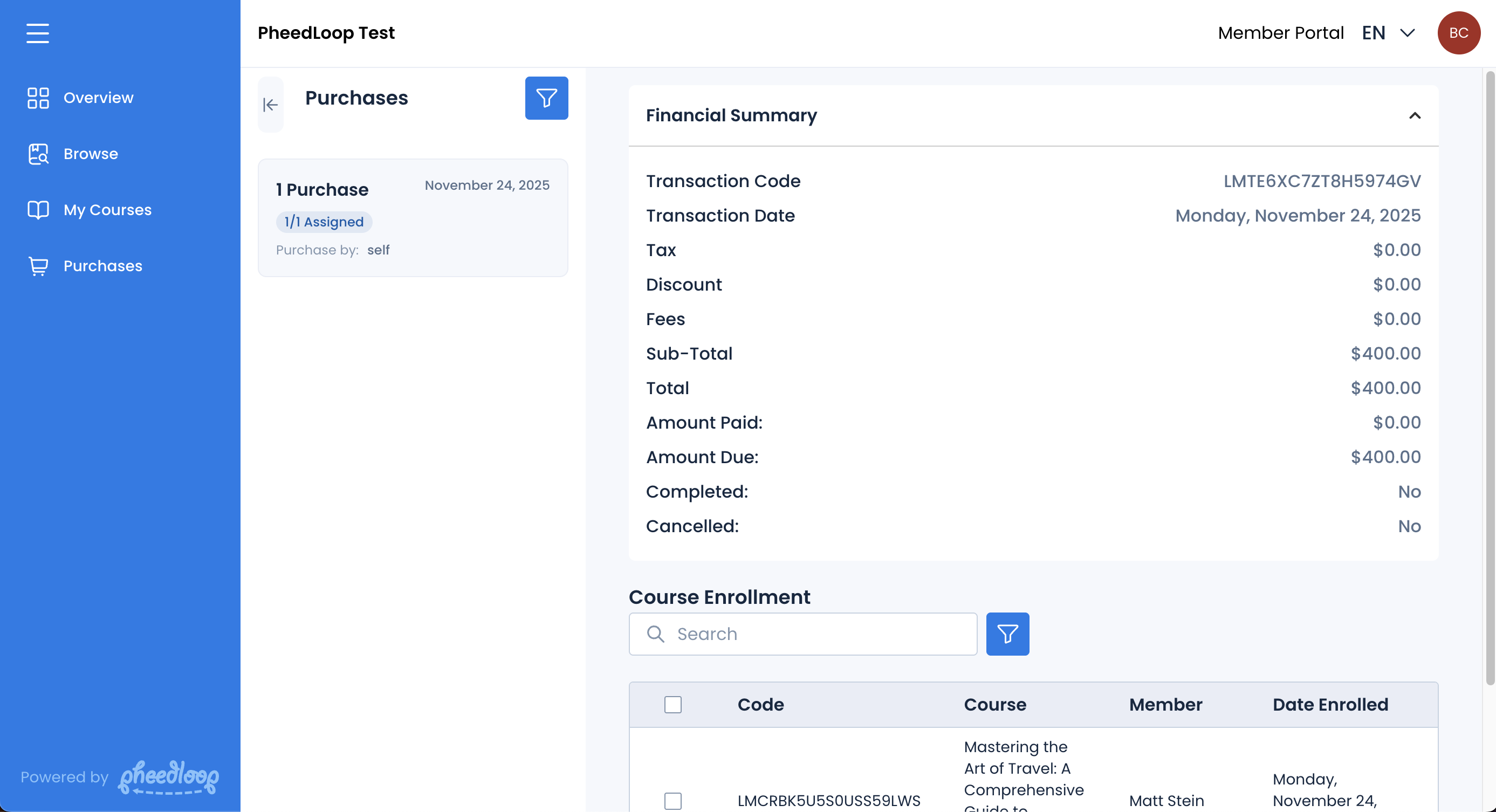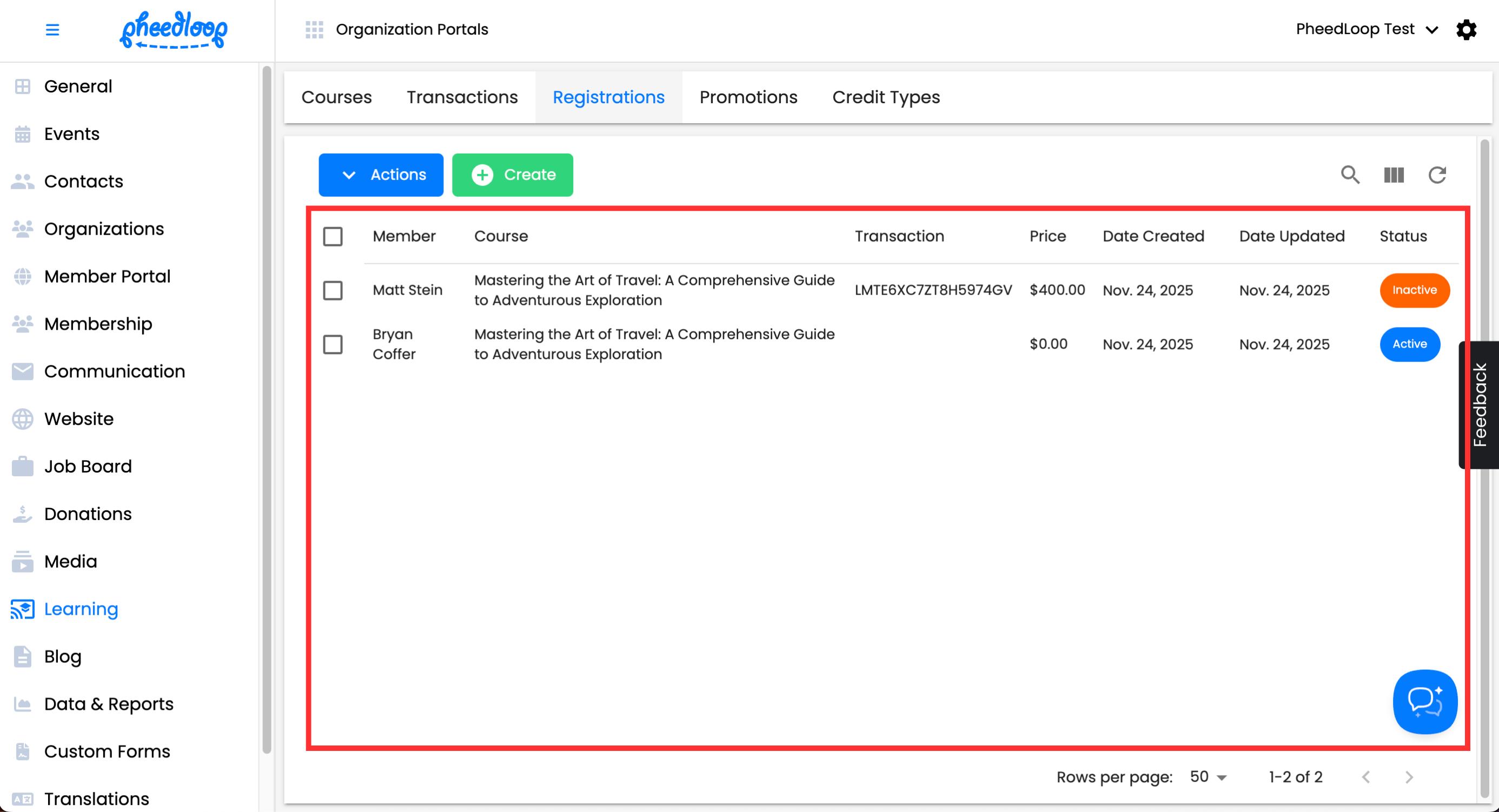 The Transactions page will display information on all existing transactions created by your members as they purchase courses. Please note that the transactions page here is unique to the Learning Management System and will not reflect transactions for things beyond the purchases made in the Learning Portal.
