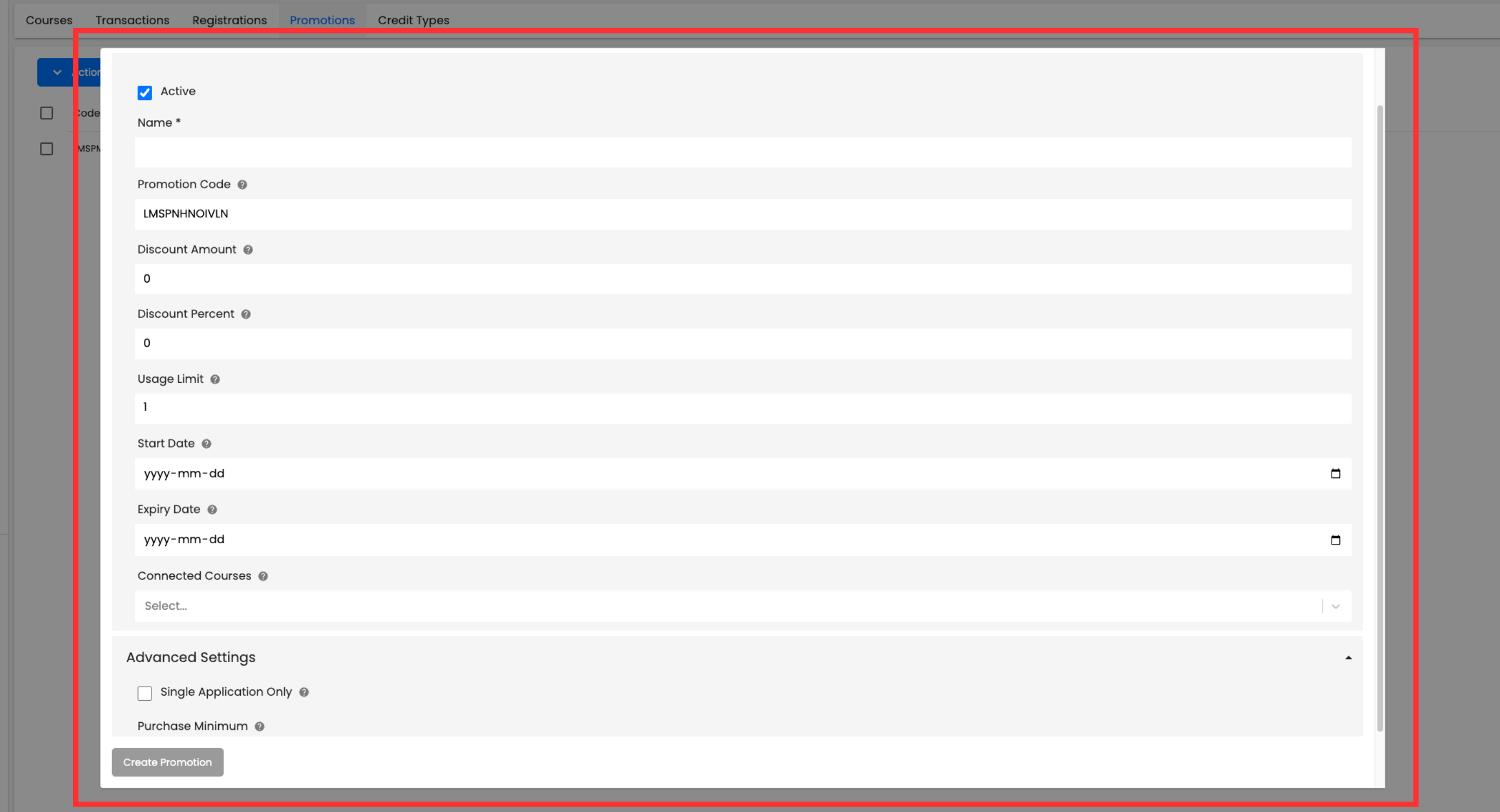 The Promotions page is where Administrators can create and manage promotions to be used in the Learning Management System. If a promotion is active, a member can use the code to gain a discount at checkout.
