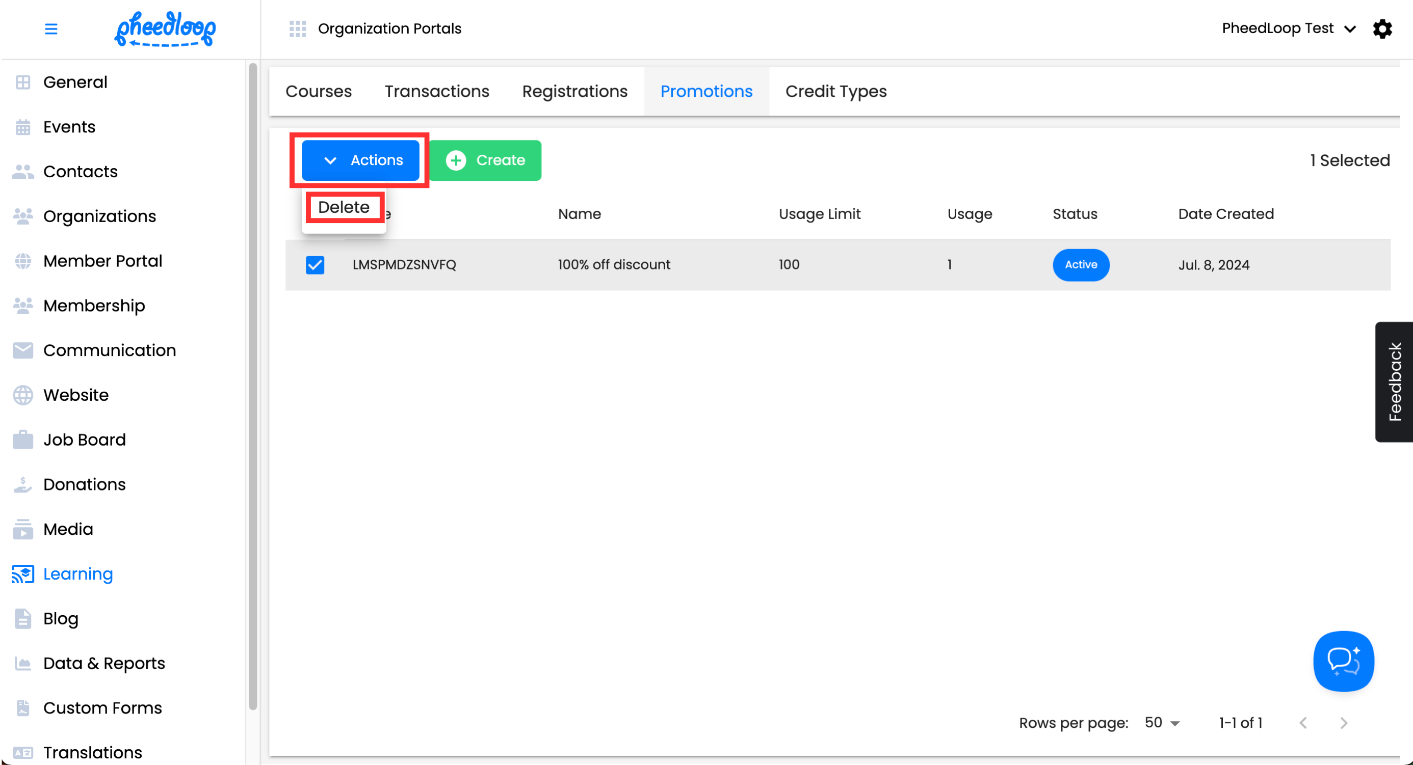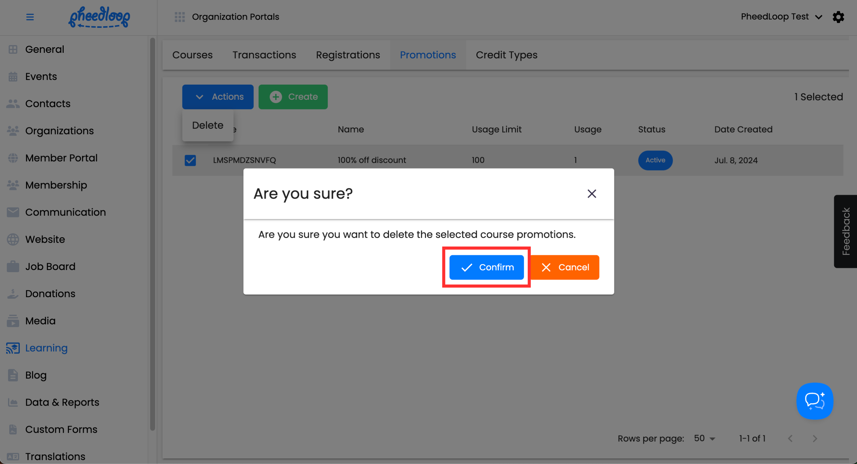 Above the Promotions table, select Actions > Delete