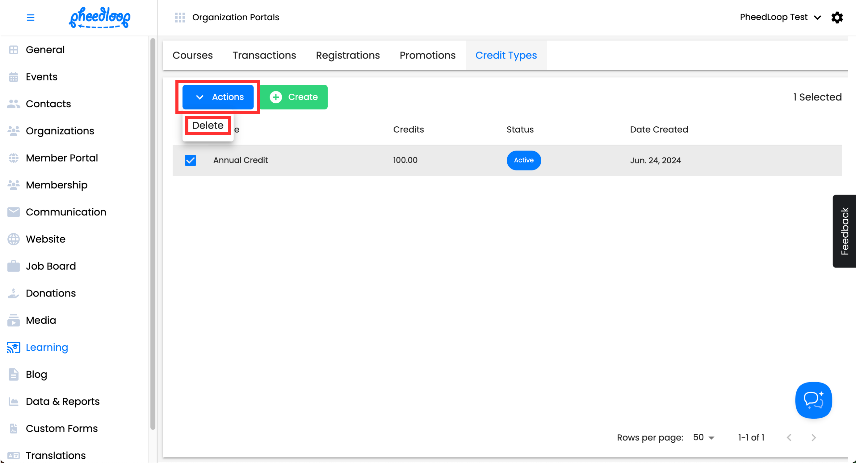 Above the Credit Types table, select Actions > Delete