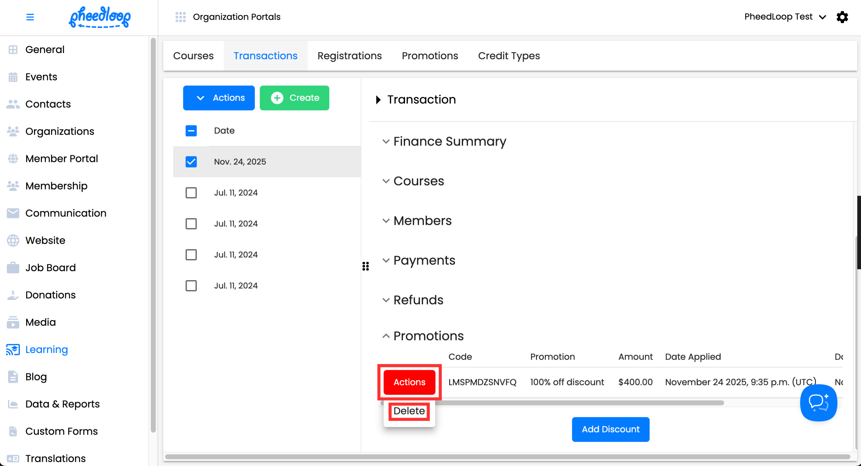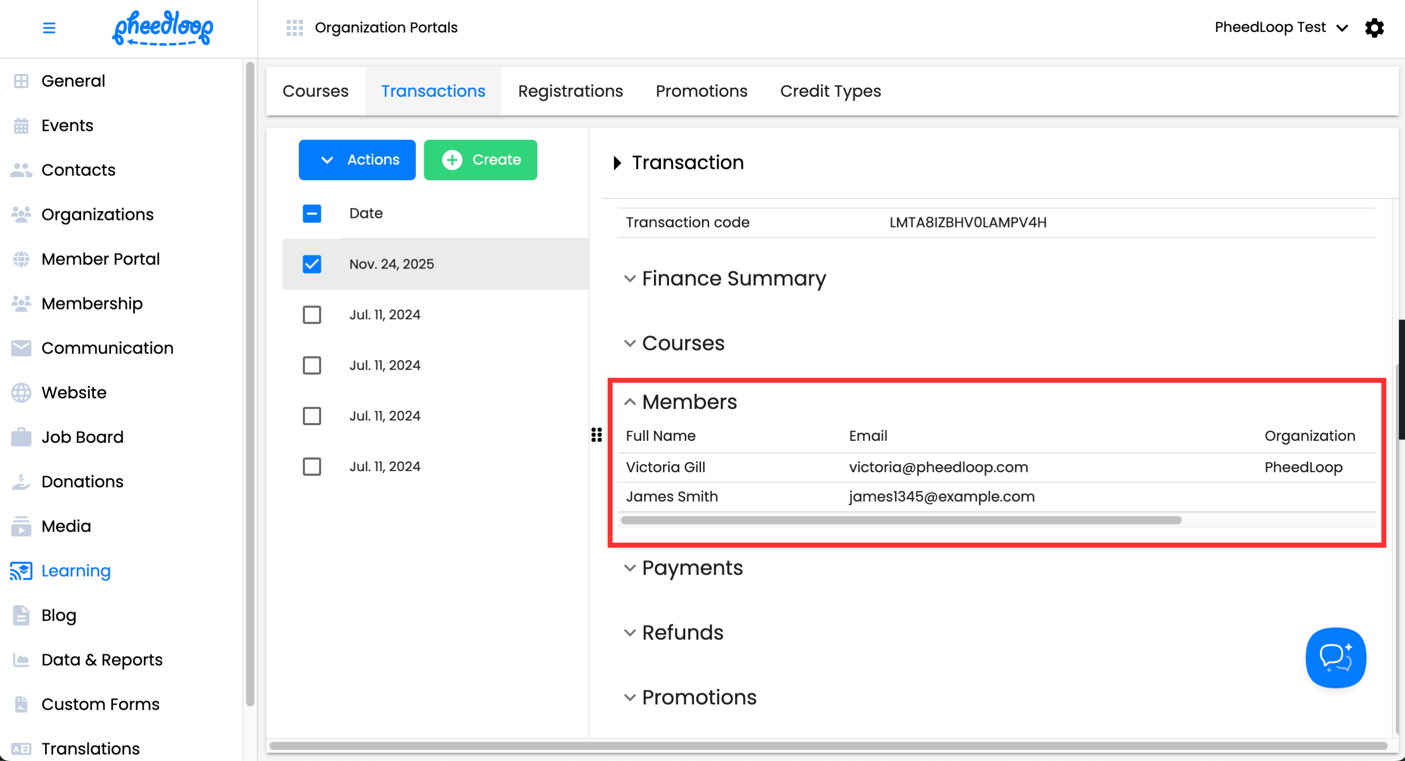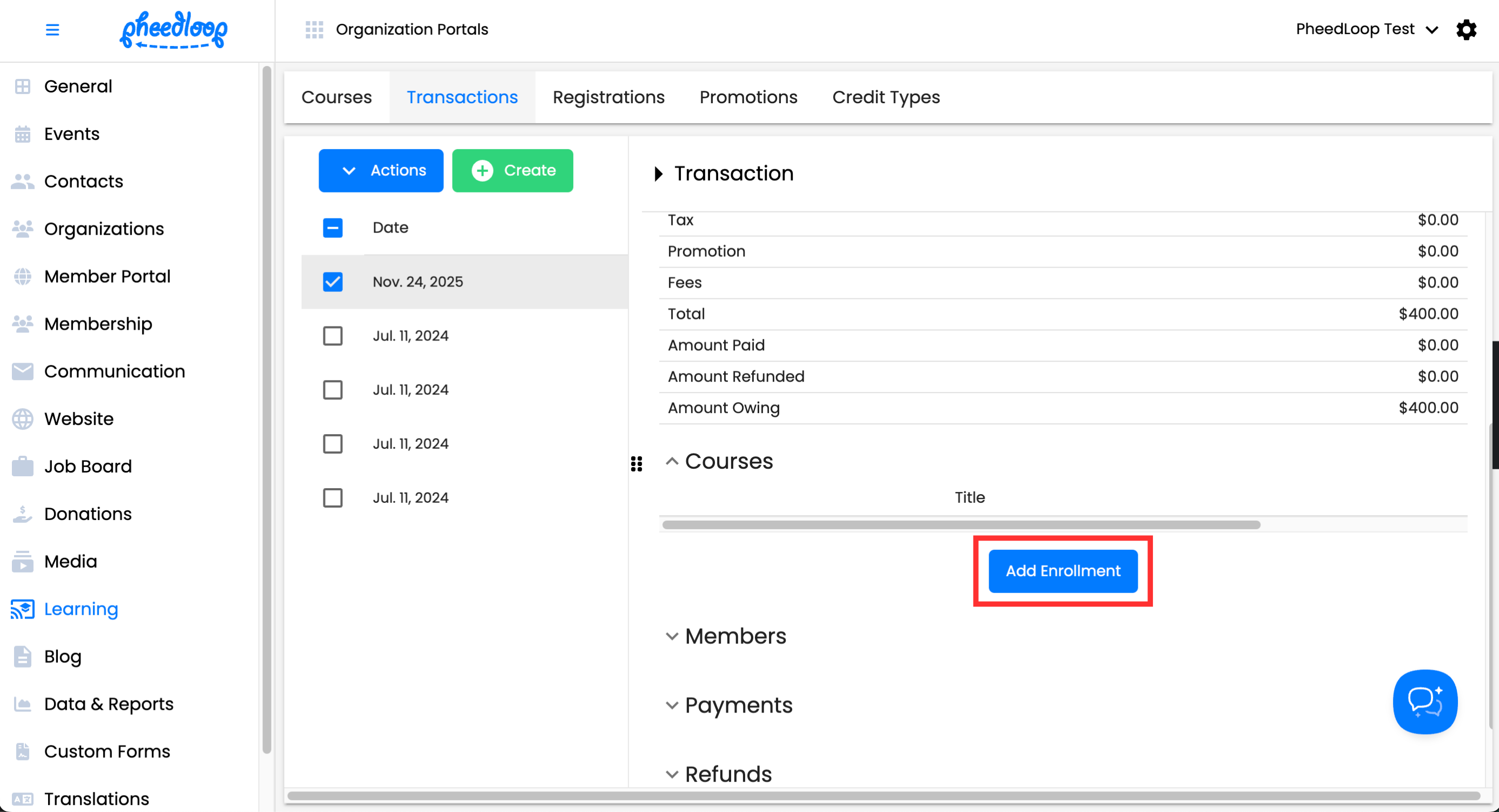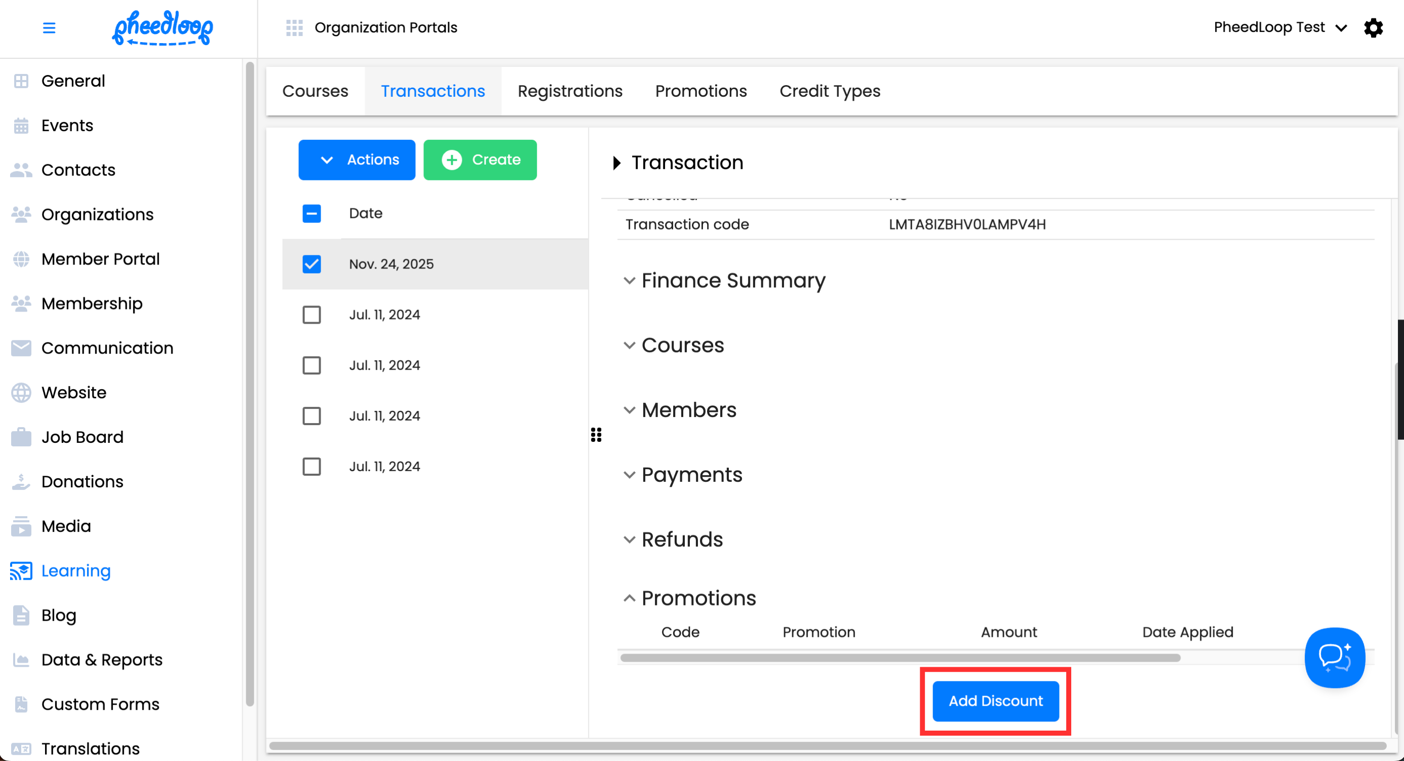 - From the Membership Dashboard, navigate to Learning > Transactions