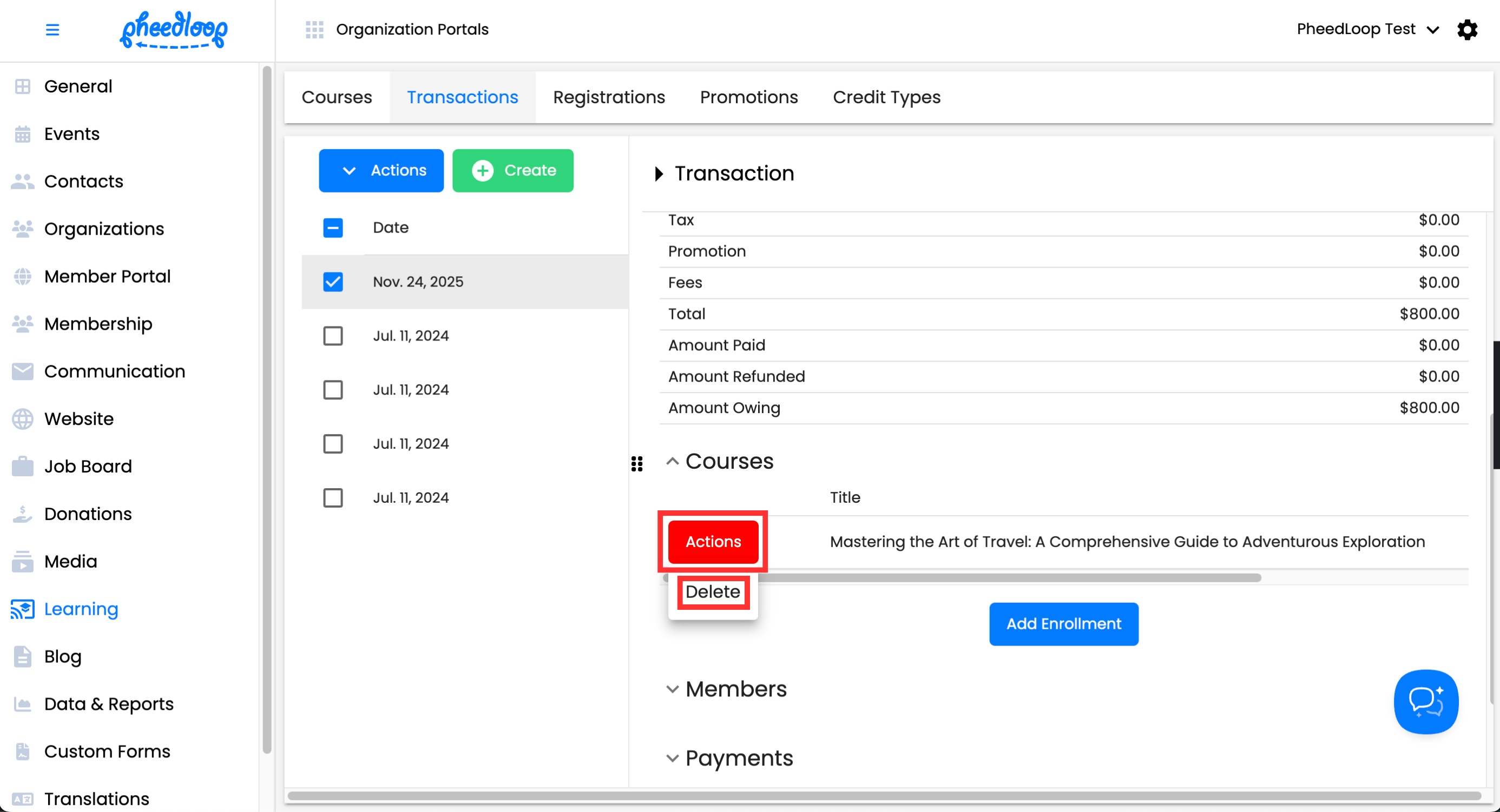 Courses can be removed from the transaction by selecting Actions > Delete.