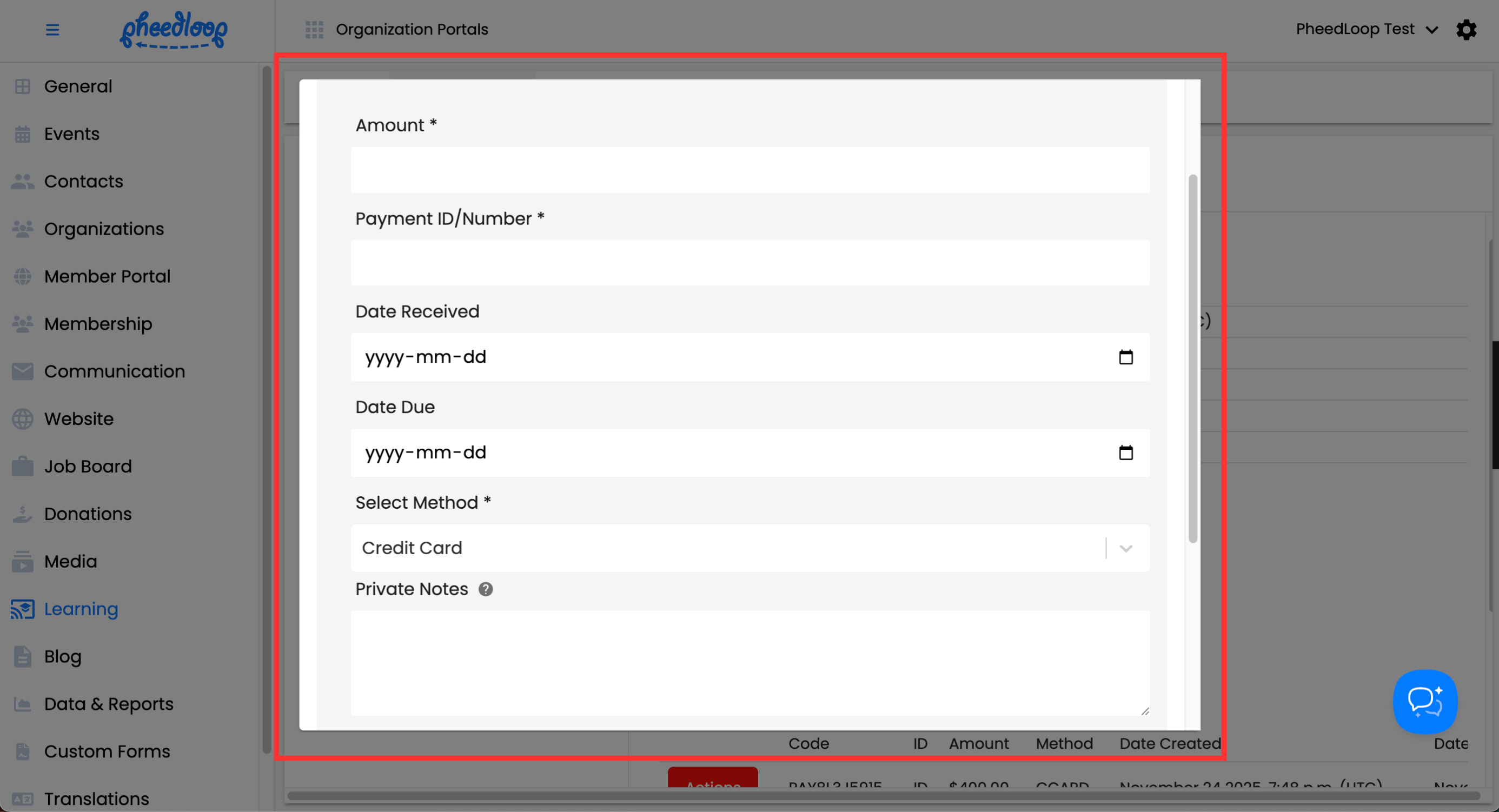 Payments provide an overview of the payment type and amount made by the Member. Administrators can use this section to add payments from other means, such as a cheque.