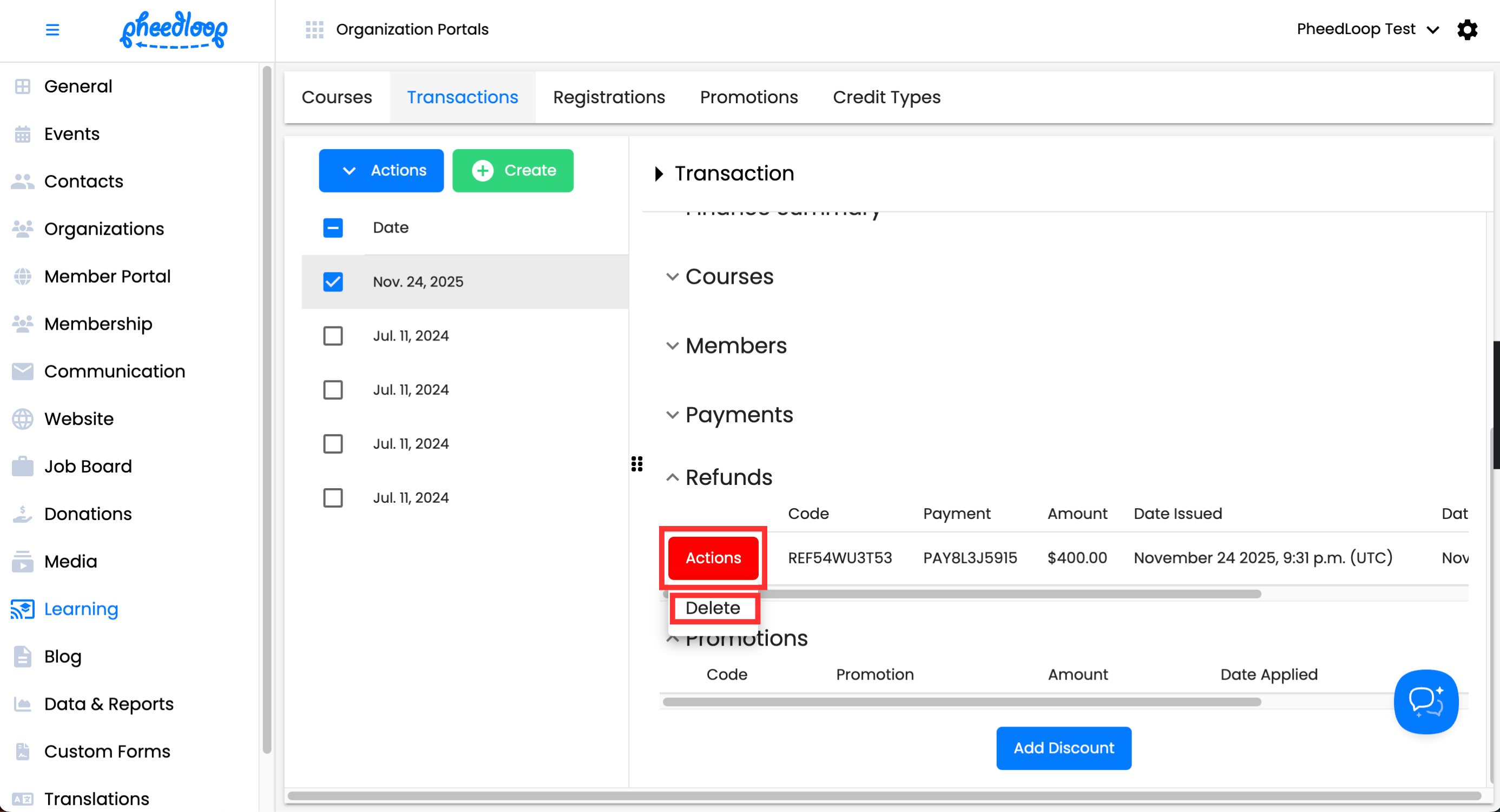 Refunds can be canceled by selecting Actions > Delete and select Confirm to verify your decision.