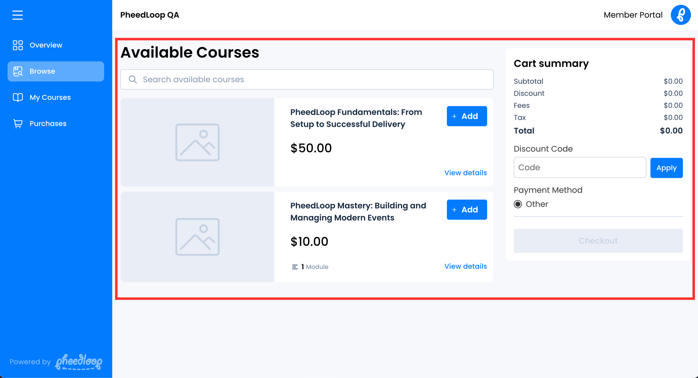 Once added, the Organization Manager can begin making purchases and assigning them to members within their organization. The Learning Portal can be accessed by navigating to the Learning page in the Member Portal.
