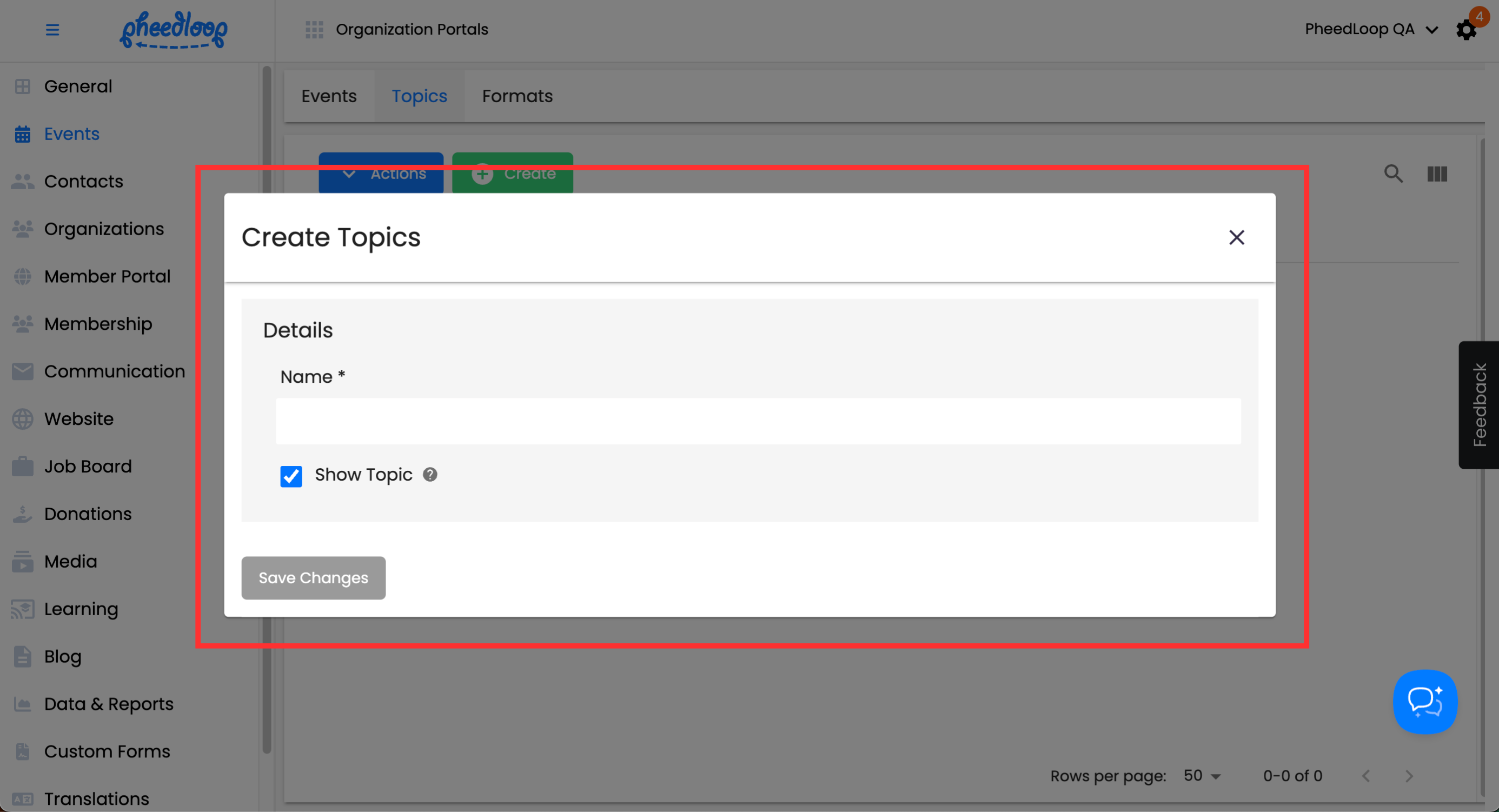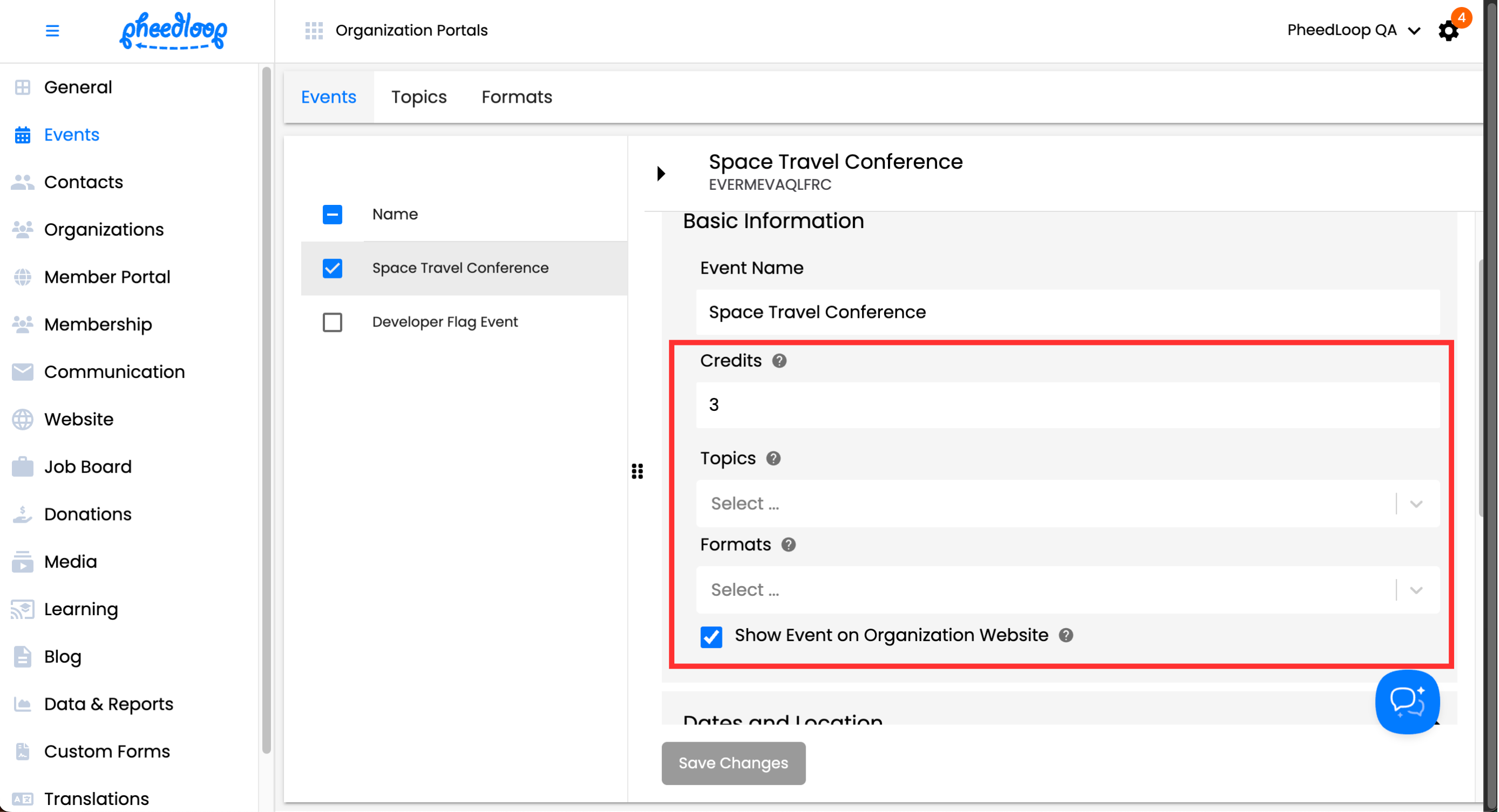 Once the Topics and Formats have been created in the Membership Dashboard, they can now be assigned to events on an individual basis. Multiple topics and formats can be assigned to a single event.